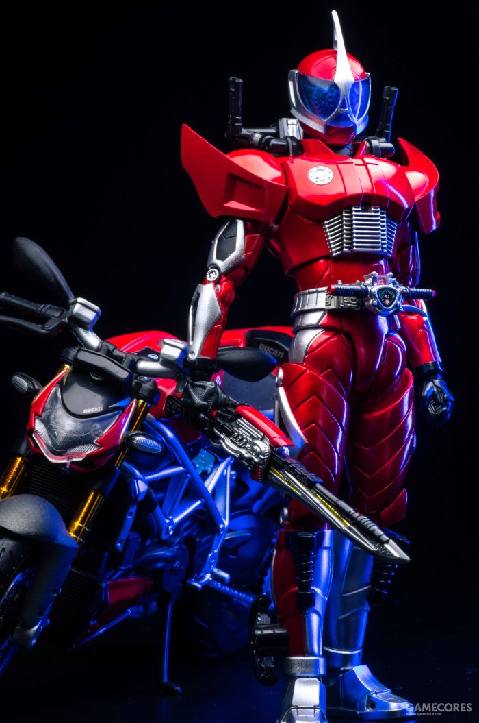 + 造型还原,作为复杂设计的假面骑士,Accel的外观设计一方面需要将摩托机车的元素“合理”地在骑士身上展现,另一方面还要兼顾变形与战斗的表现力。能将两个方向能集中在人形的角色皮套上,本次真骨雕产品的还原做得挺好。