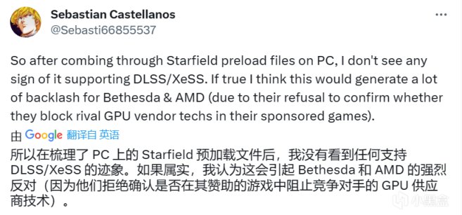 據玩家 Sebastian Castellanos 挖掘《星空》的預載文件顯示,遊戲不支持Intel的XeSS技術或NVIDIA的DLSS 技術。遊戲只支持AMD的FSR 2.0。