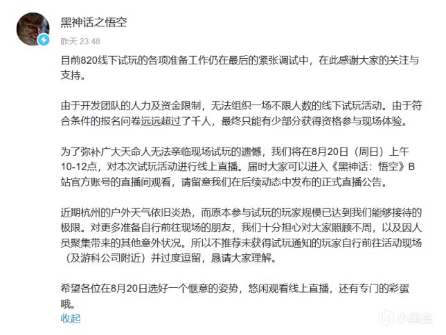 本次活動只有千名玩家可以參與。爲了彌補廣大天命人無法親臨現場試玩的遺憾,官方將在8月20日(週日)上午10-12點,對本次試玩活動進行線上直播。屆時大家可以進入《黑神話:悟空》B站官方賬號的直播間觀看,