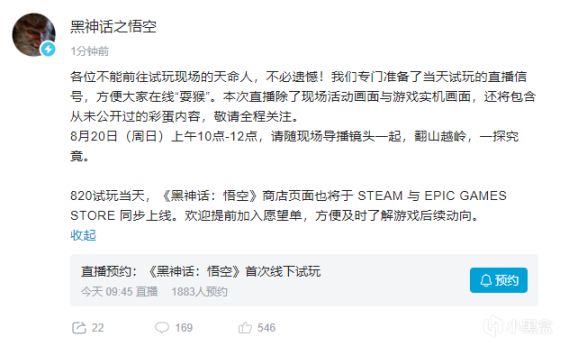 各位不能前往試玩現場的天命人,不必遺憾!我們專門準備了當天試玩的直播信號,方便大家在線“耍猴”。本次直播除了現場活動畫面與遊戲實機畫面,還將包含從未公開過的彩蛋內容,敬請全程關注。8月20日(週日)上午10點-12點,請隨現場導播鏡頭一起,翻山越嶺,一探究竟。820試玩當天,《黑神話:悟空》商店頁面也將於 STEAM 與 EPIC GAMES STORE 同步上線。歡迎提前加入願望單,方便及時瞭解遊戲後續動向。
