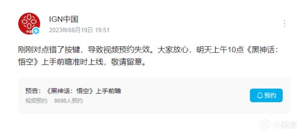 IGN将于8月20日上午10点发布《黑神话:悟空》上手前瞻,其中将会包含最新的游戏画面以及其他信息,与此同时,《黑神话:悟空》官方也在B站直播游戏线下试玩会。