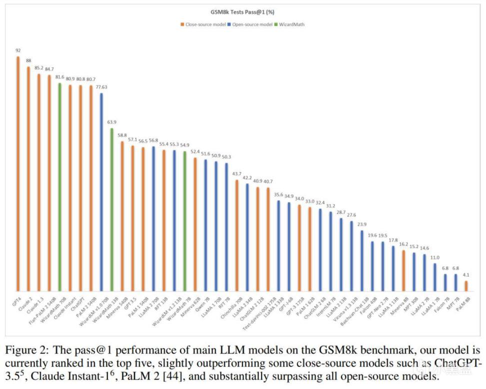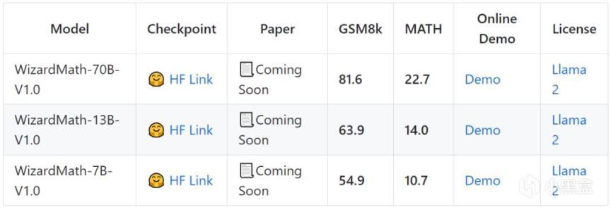 WizardMath一共分爲70B、13B、7B三個參數規模,其中WizardMath-70B-V1.0 模型在 GSM8k 基準測試中達到 81.6 pass,比之前最強的大模型還要高出24.8分!