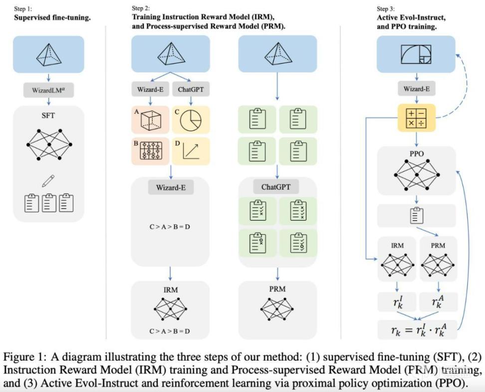 論文中詳細介紹了“Reinforced Evol-Instruct”方法,即在LLaMA模型的基礎上,利用AI來代替人類自動生成涵蓋各種難度級別開放域指令,然後利用該方法生成很多數學領域相關的指令,對羊駝進行微調得到了WizardMath。