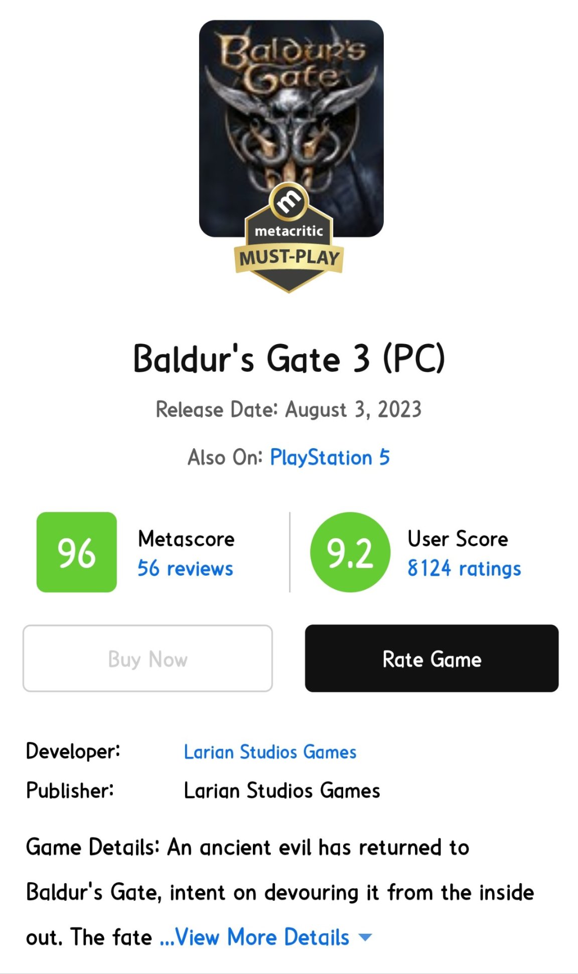 此外,根据Metacritic的数据显示,《博德之门3》目前的平均评分为96,与《塞尔达传说:王国之泪》持平,暂时位列今年目前为止评分最高游戏的有史以来第八高。这一评分无疑进一步证明了《博德之门3》在游戏界的影响力和受欢迎程度。