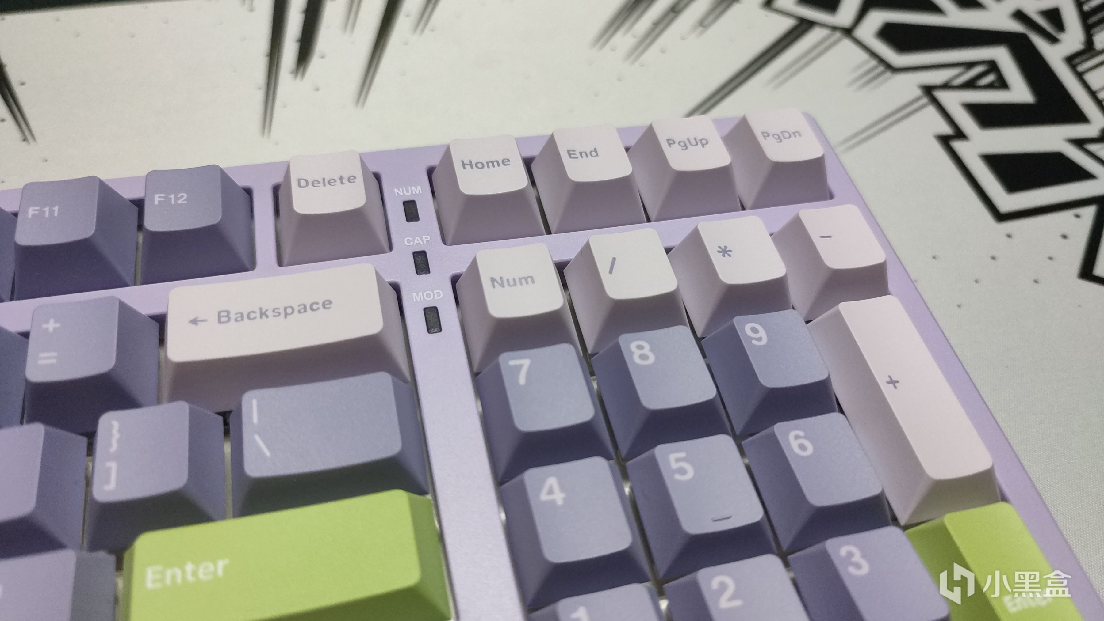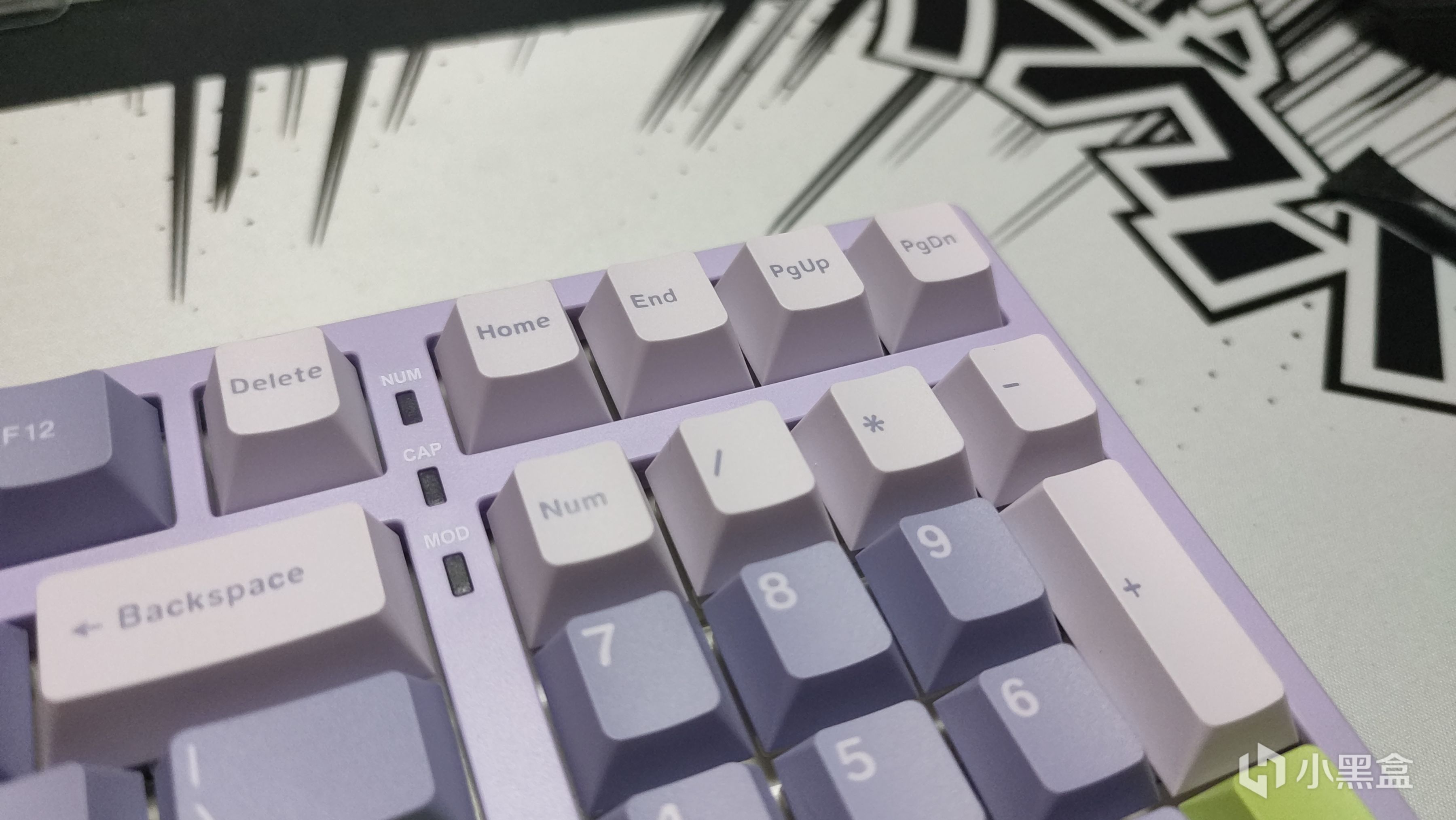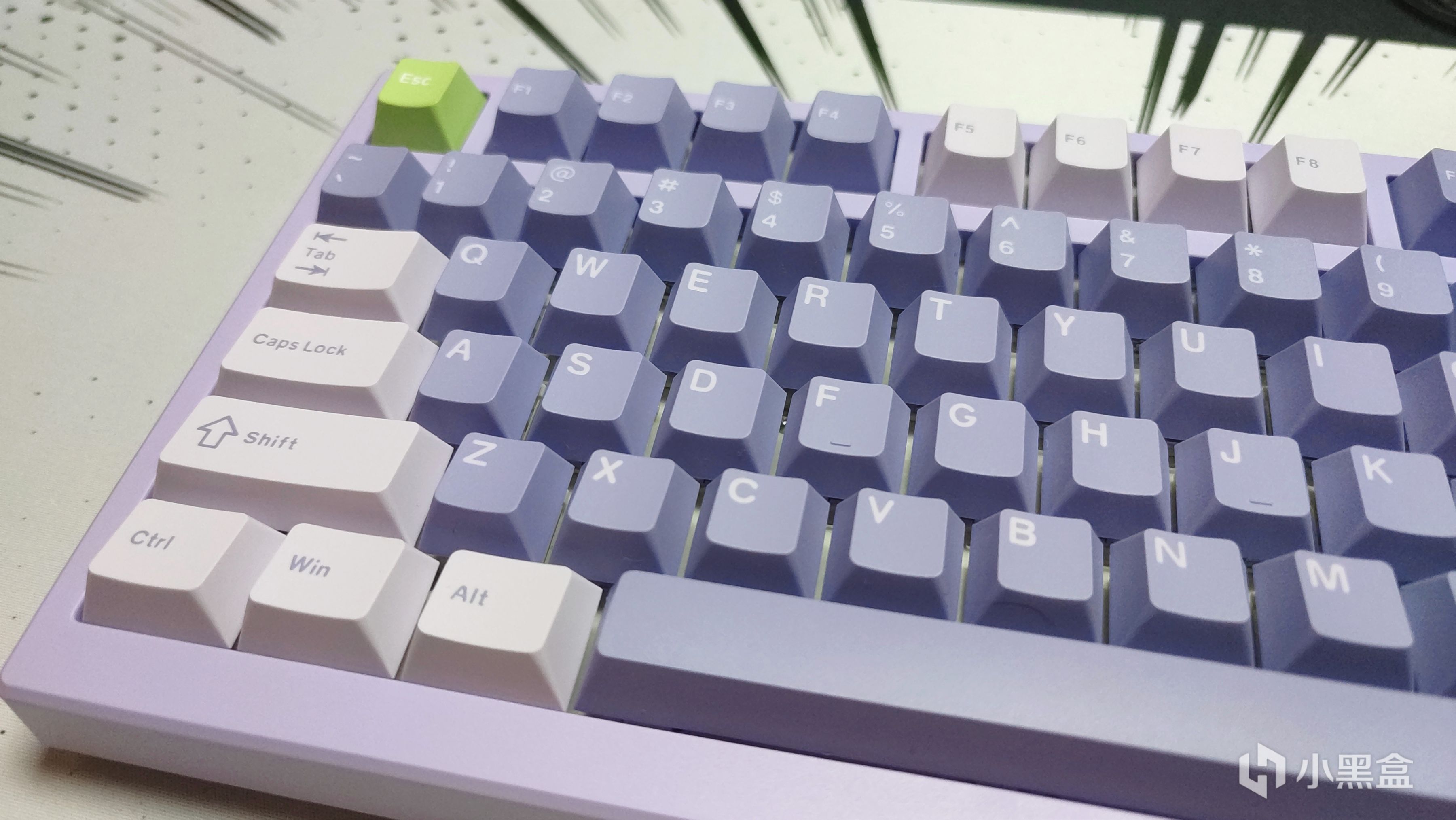 這一套鍵帽是薰衣草配色,很好的和鍵盤套件呼應,整體的顏色是紫色,但是飽和度偏低,整體的搭配還算不錯,部分鍵位用了綠色點綴,顏值挺高,小清新配色。