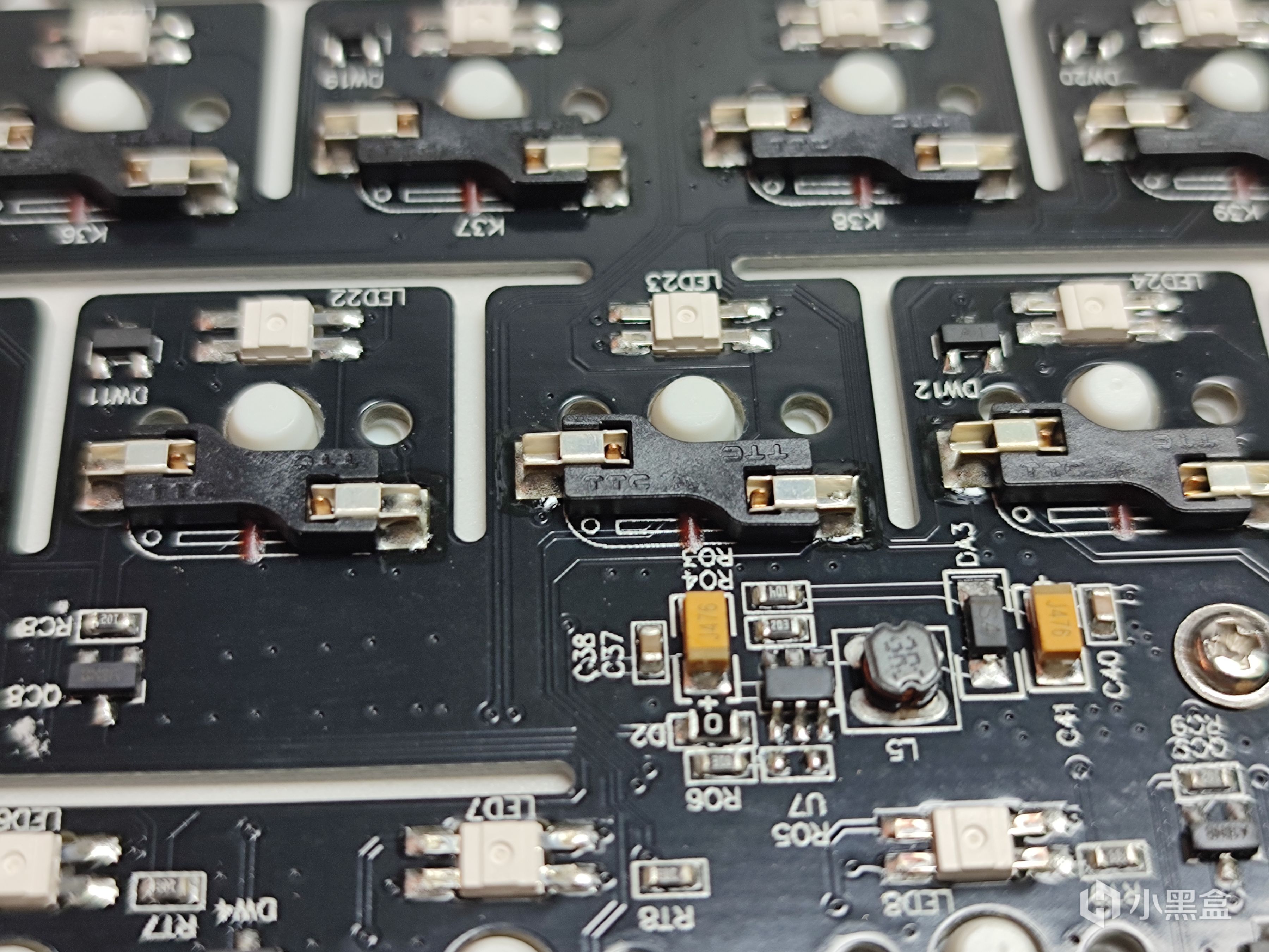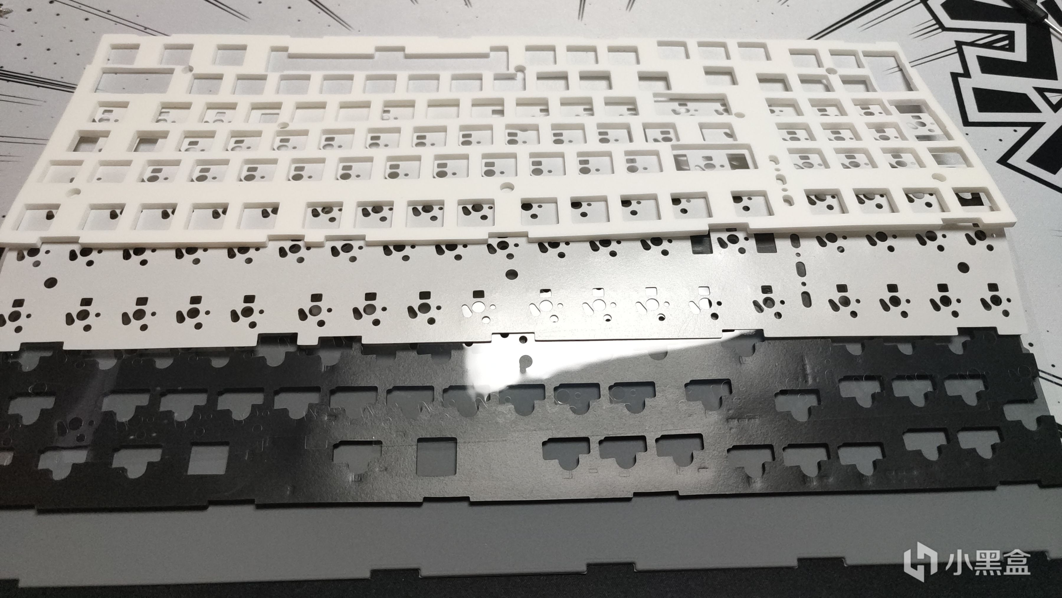 定位板採用的橫向開槽+PC材質的組合,最近也是經常看到這個組合,一定程度上能增加鍵盤軟彈程度以及按鍵手感的一致性。新盟這個PC定位板並沒有採用霧透,而是全透PC,RGB亮度會更高,但是隨之而來的就是經常插拔軸體的話可能會有明顯的剮蹭痕跡。