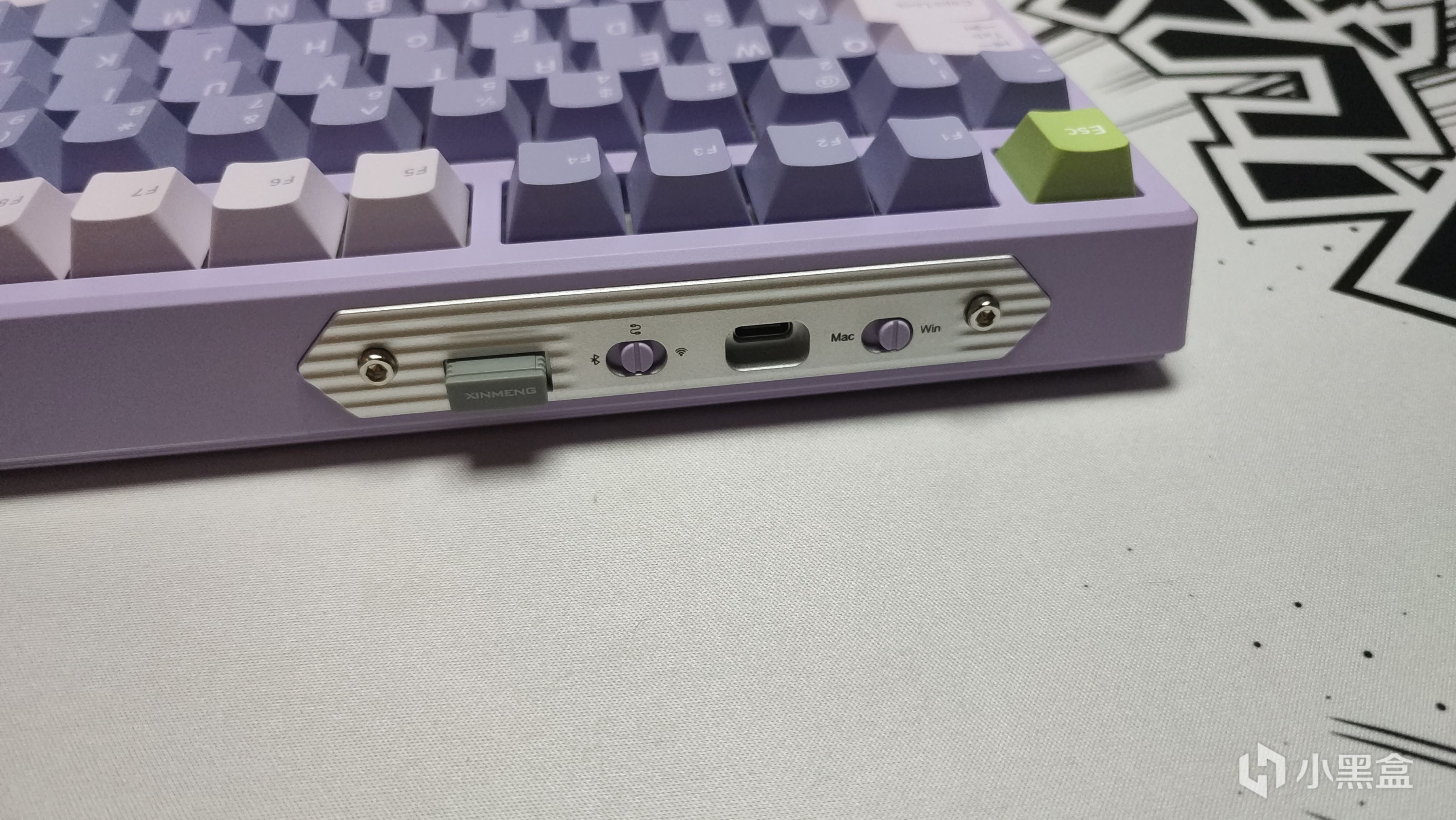 後側面靠右側位置有一塊鋁合金擋板,上面涵括了這把鍵盤所有的實體按鍵,同時也包括了接口和收納倉。從左到右依次是2.4G接收器收納倉、三模切換開關、數據線接口、WIN/MAC系統切換開關。