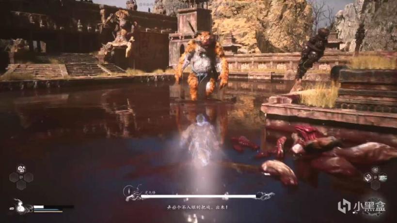 第二个头目挑战是《西游记》混世四候之一的赤尻马猴,场景为官方发布的12分钟UE5实机测试集锦中的批霜道。本关在头目挑战前加入了杂兵战和上香点,这里的上香点直白的说就是soullike中的篝火,上香后可以调休恢复体力补充葫芦并且刷新妖怪,还可以调整当前携带的法术。赤尻马猴是这次试玩六个头目中令我印象最深的一个,原因是我与同事在体验的过程中发现二人所挑战的赤尻马猴有所差异,笔者挑战的赤尻马猴与实机演示中的无异,而一旁的同事的屏幕中却出现了长着黑色翅膀的马猴。在数次的尝试后发现赤尻马猴被打倒半血后会向玩家求饶,如果你将其放走在后续的战斗中赤尻马猴就会化为长有黑色翅膀的形态,这也符合《西游记》原著中赤尻马猴“晓阴阳,会人事,善出入,避死延生。”的描写。