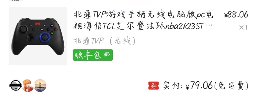 - 手柄肯定不能少,但是由于预算严重不足,就买了个北通的tvp,这个价格能有无线加上线性扳机要啥🚲,他甚至还送了我收纳包ʕ•ᴥ•ʔ,扳机的键程稍微短了点但也够用了(至少没有虚位),摇杆也还行,除了肩键稍微拉了点,其实我当时是急着买价格还是有点高了,兄弟萌要买的话可以在某多上多看看收藏起来然后每晚八点夜黑风高里面蹲,可以蹲到69的价格,69入的话还是非常香的