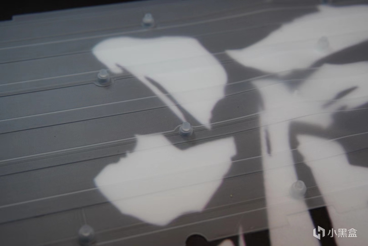 同时呢键盘并不是没有用底棉,键盘底棉采用了一块带支撑结构的硅胶底棉,这个底棉说白了对键盘的声音没有啥太大的作用,但是能有效防止键盘的共振产生,以及给键盘起到一个支撑的作用。