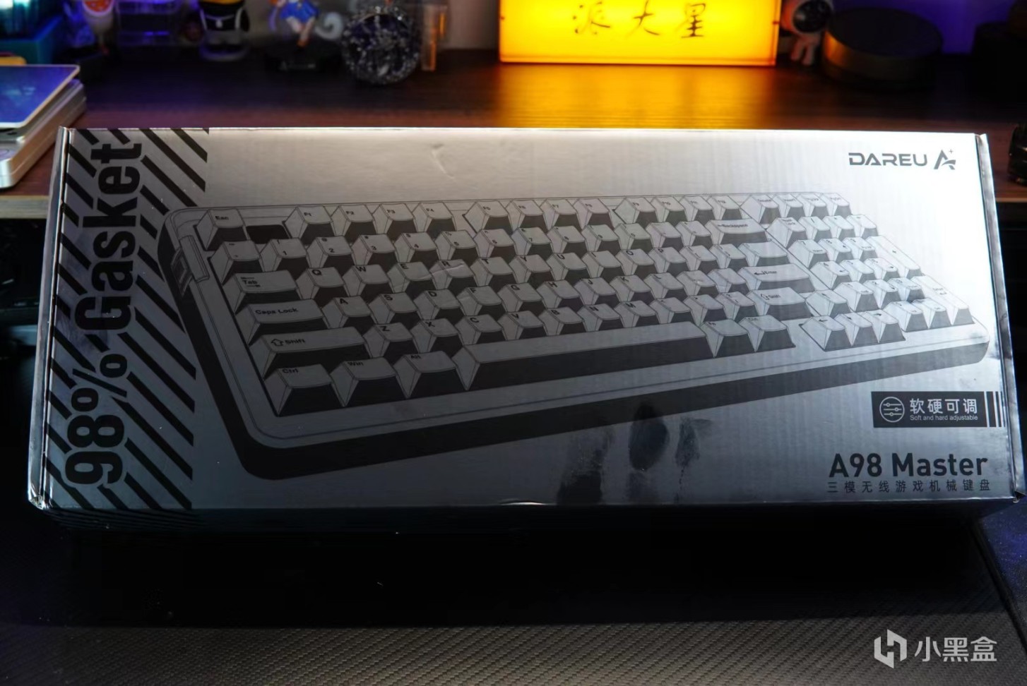 外包装还是达尔优之前传统的外包装,但是说实话这个外包装是真的难拍摄,一直对不上焦,但是说实话外包装设计的还不错,确实好看,右下角是这把键盘的型号以及特意强调了,这把键盘的软硬可调。