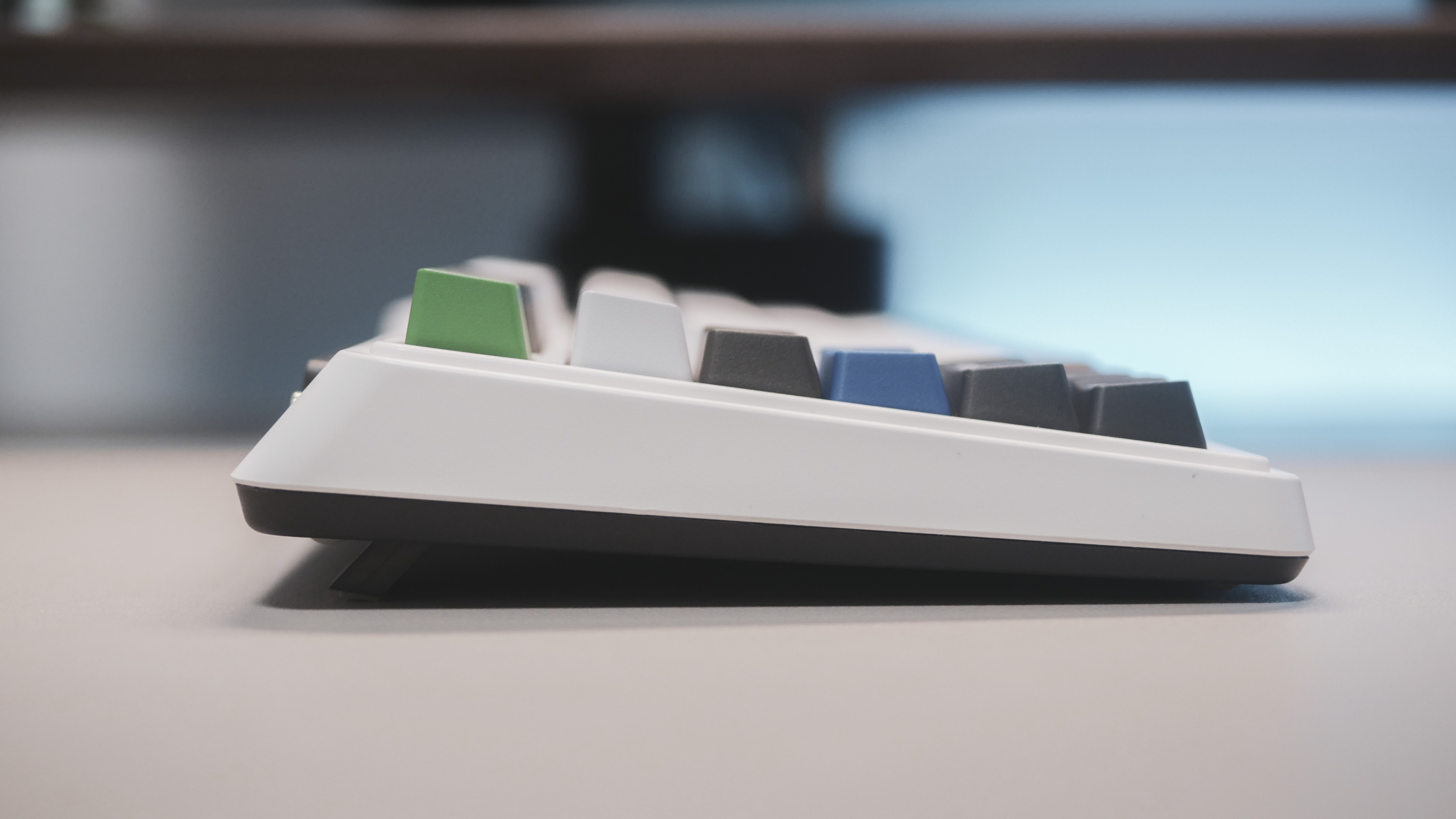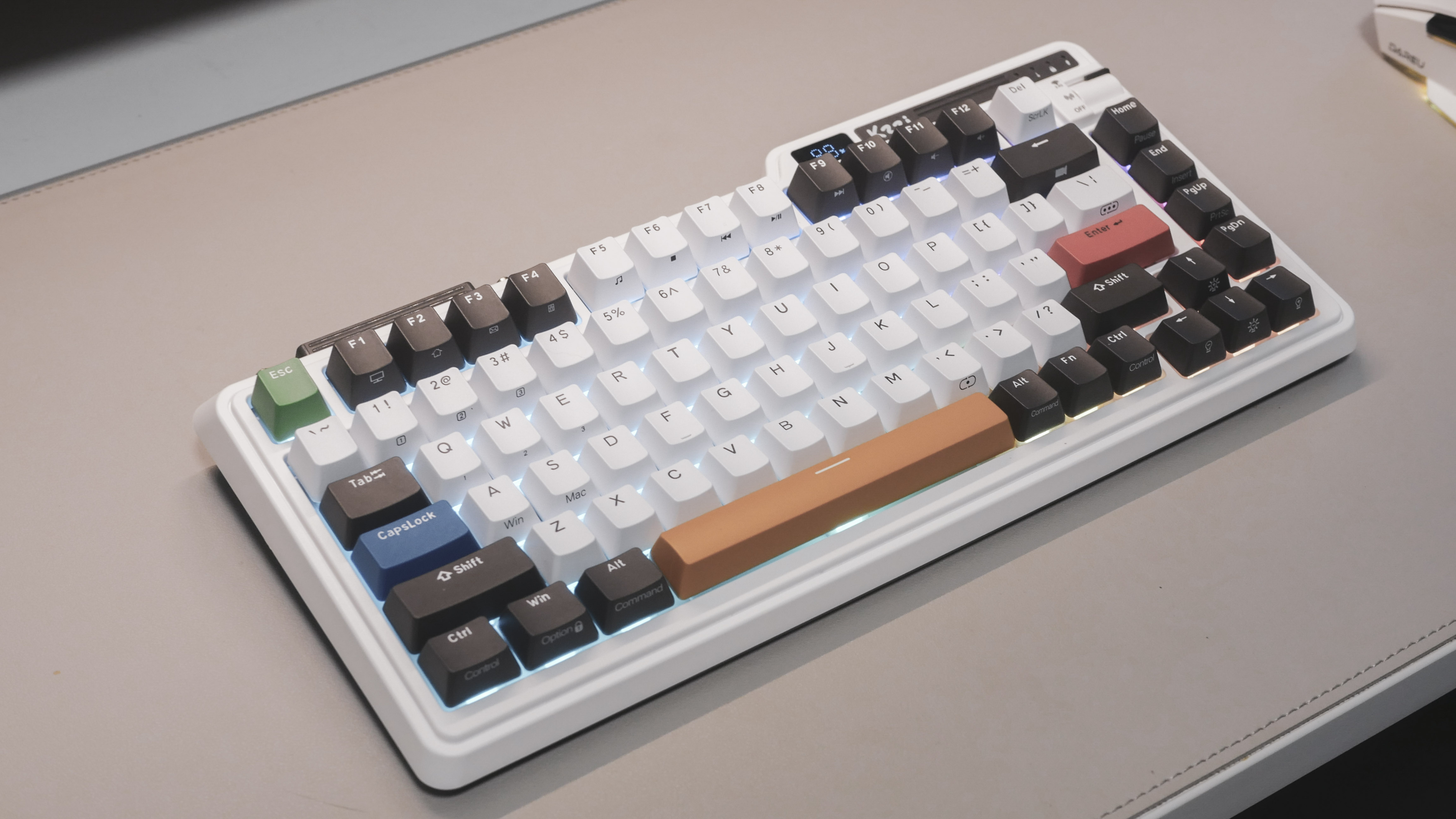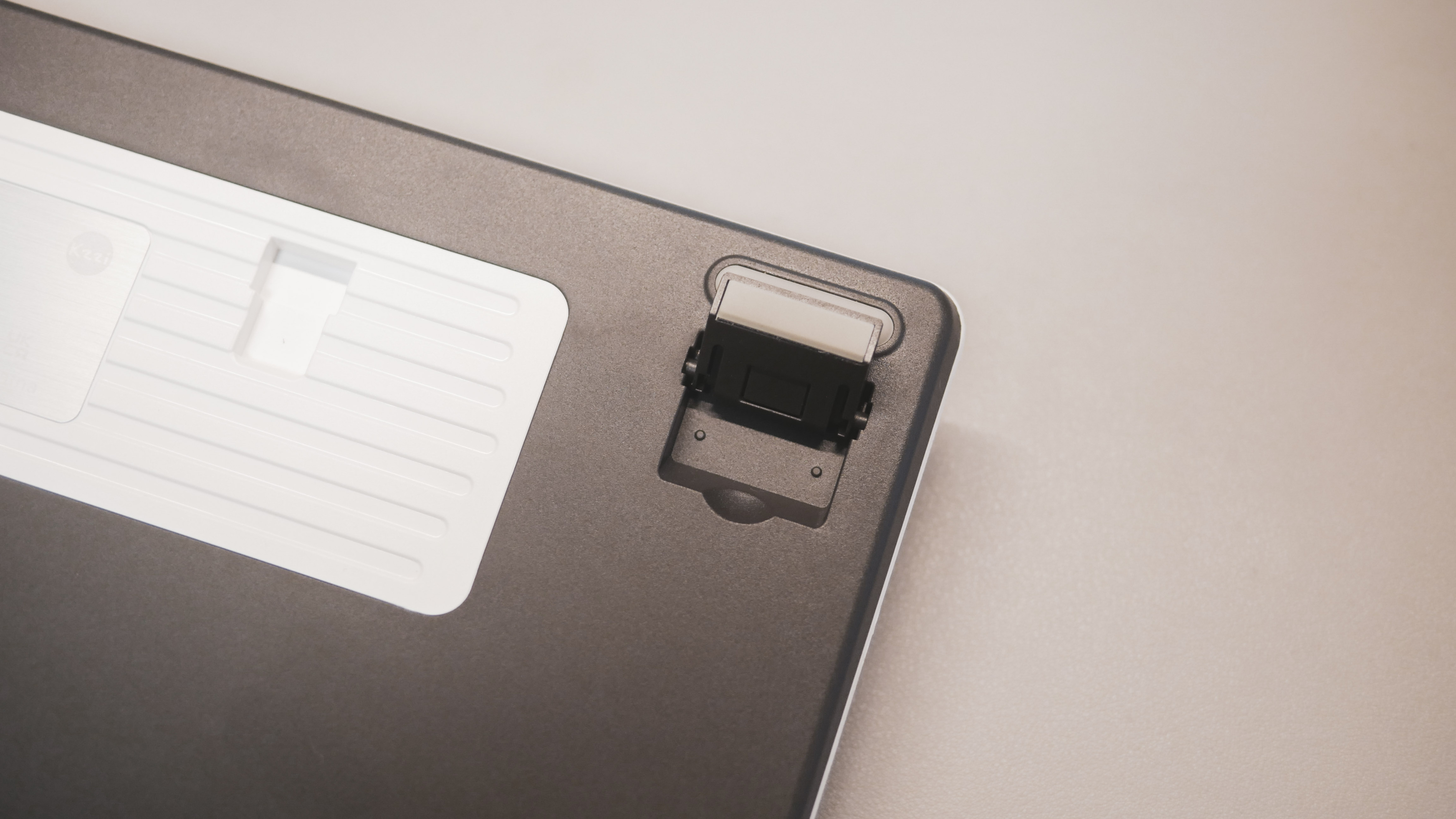 K75是一款三模机械键盘,支持有线、蓝牙和2.4G的连接。底部有独立的2.4G收纳仓,两段式的脚撑,可以根据打字习惯调节键盘的倾角。