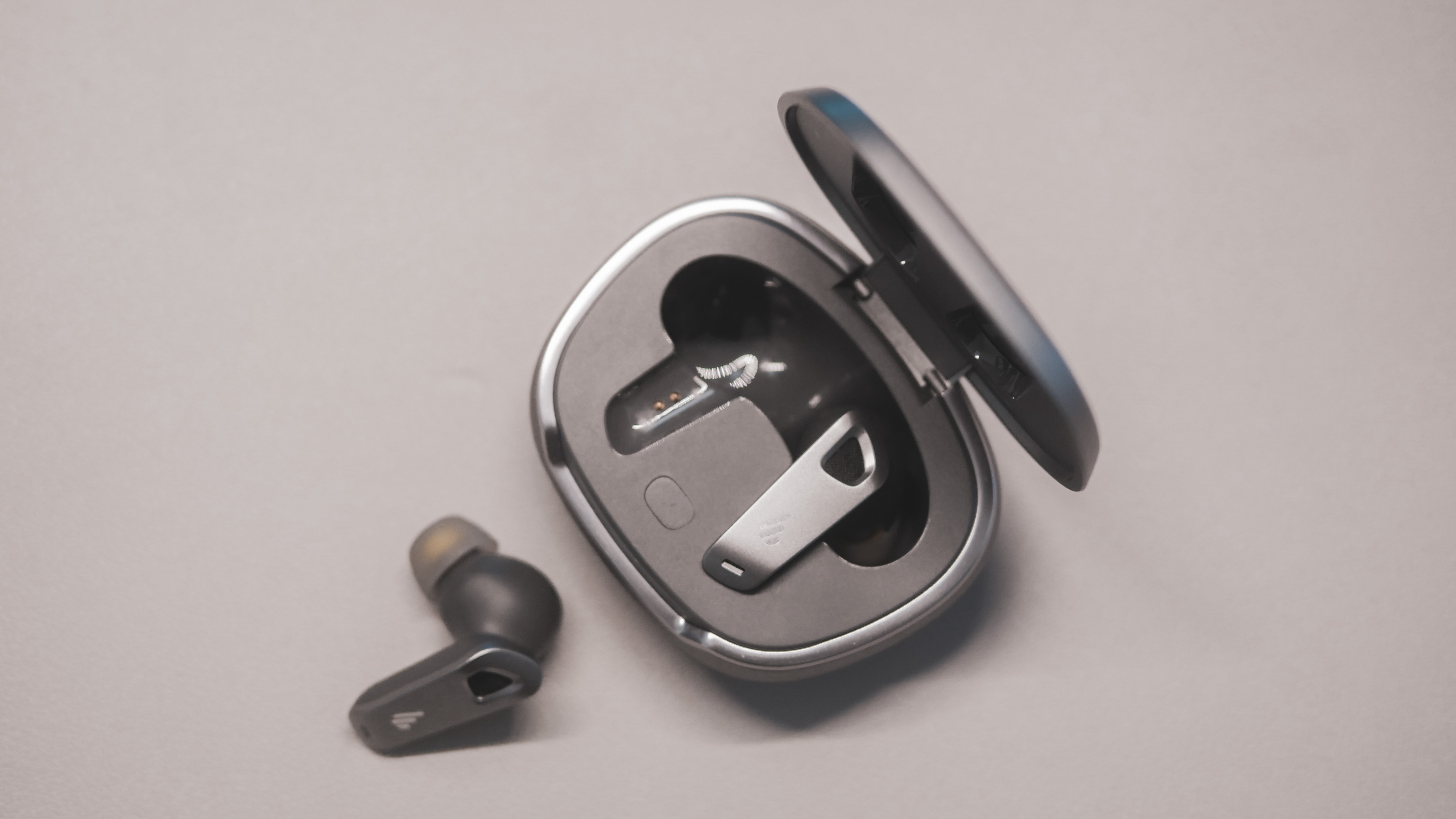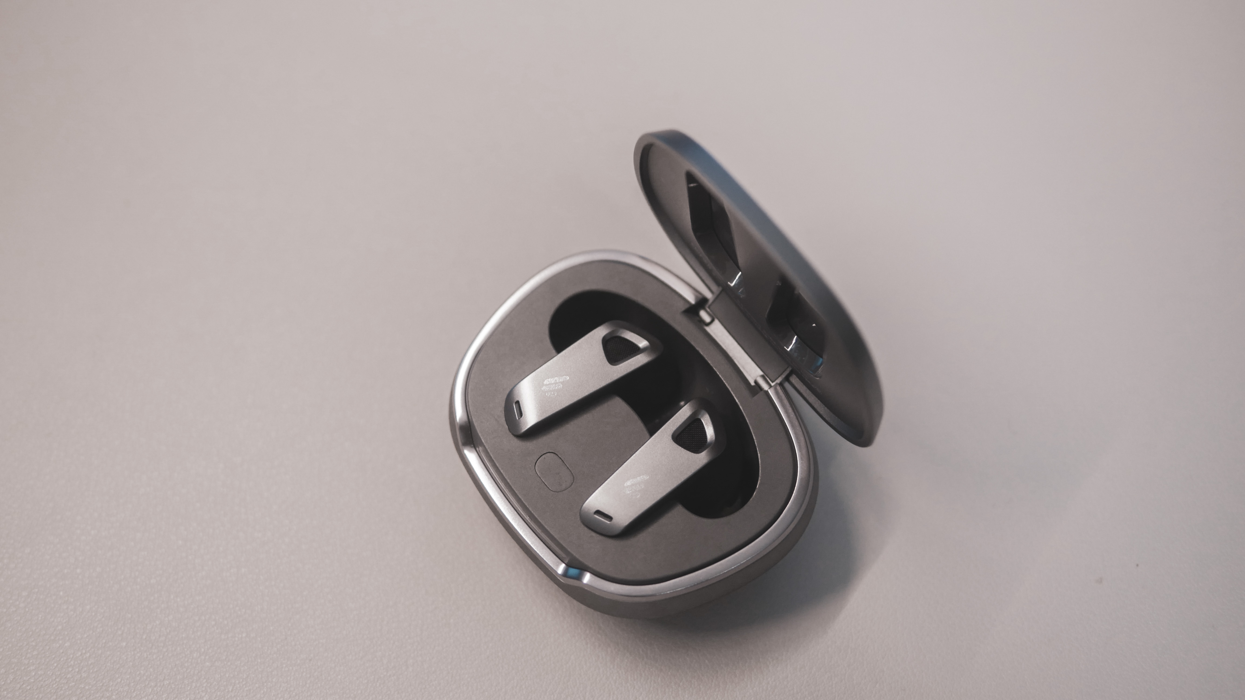 NeoBuds Pro2有两个配色,我使用的是银灰色配色。外观小巧时尚,金属质感很强。充电仓很有设计感,整体造型偏圆润,一圈哑光银色的金属装饰件。中间有正面有指示灯的设计,而且连接的时候还有动态效果,科技感十足。顶面的高亮logo也非常漂亮,细节做工也非常的精致。