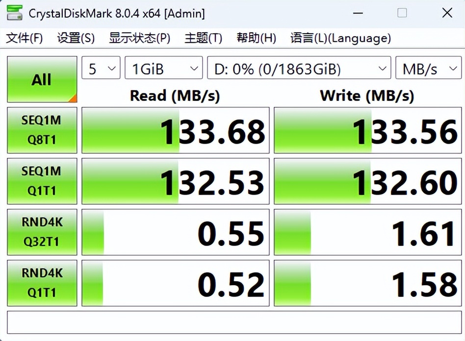 在win11下使用CrystalDiskMark进行速度测试,数据传输速度实测133MB/S,读取和写入基本上持平,对于机械硬盘来说,这个传输速度很不错啦。