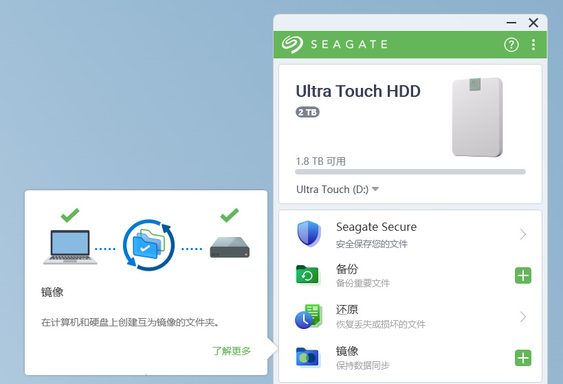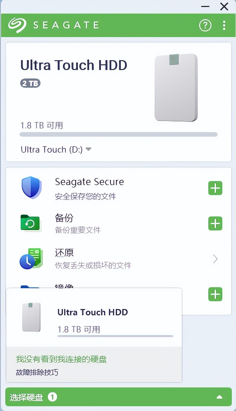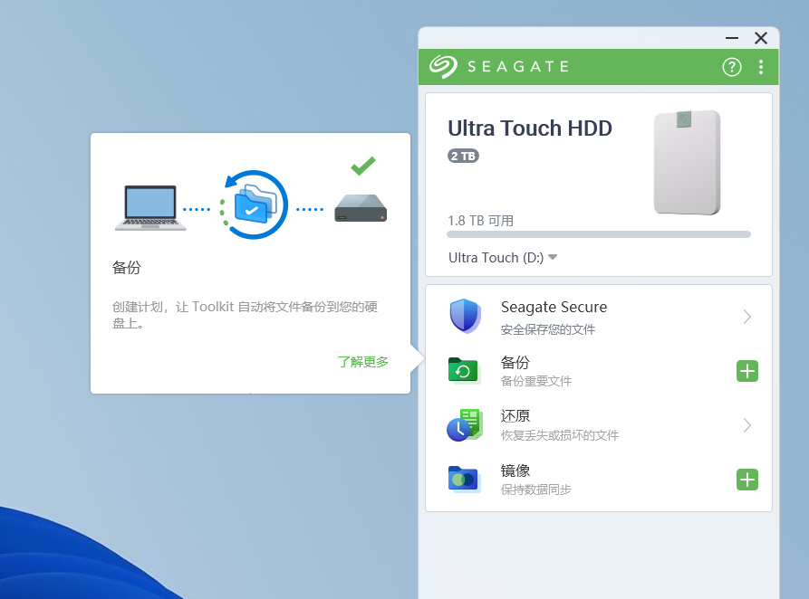 希捷的移动硬盘自带了Toolkit软件,可以对硬盘进行数据备份,加密保护,使用过程非常方便。安装好软件,插上硬盘,软件可以自动识别到我们的移动硬盘。