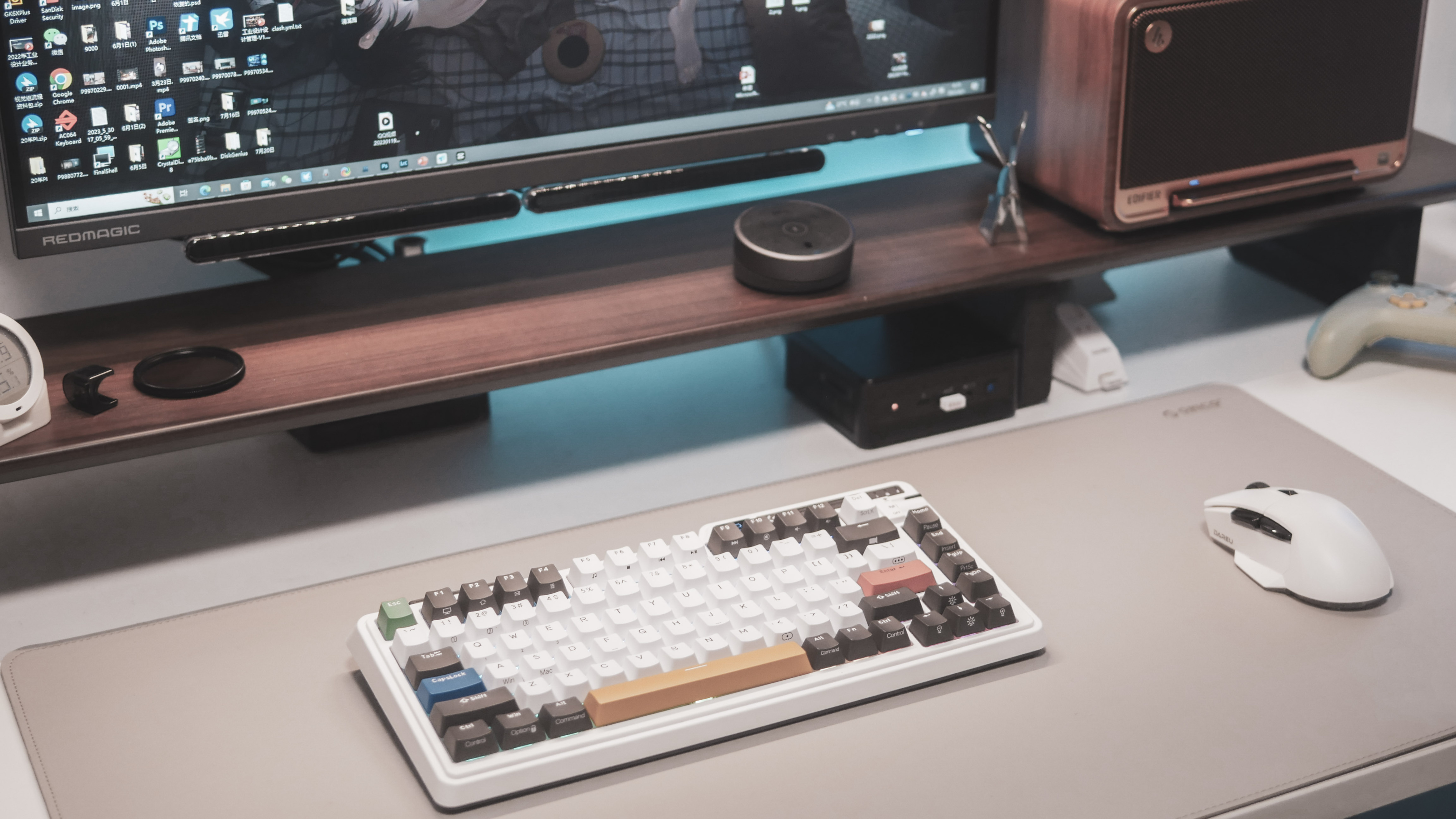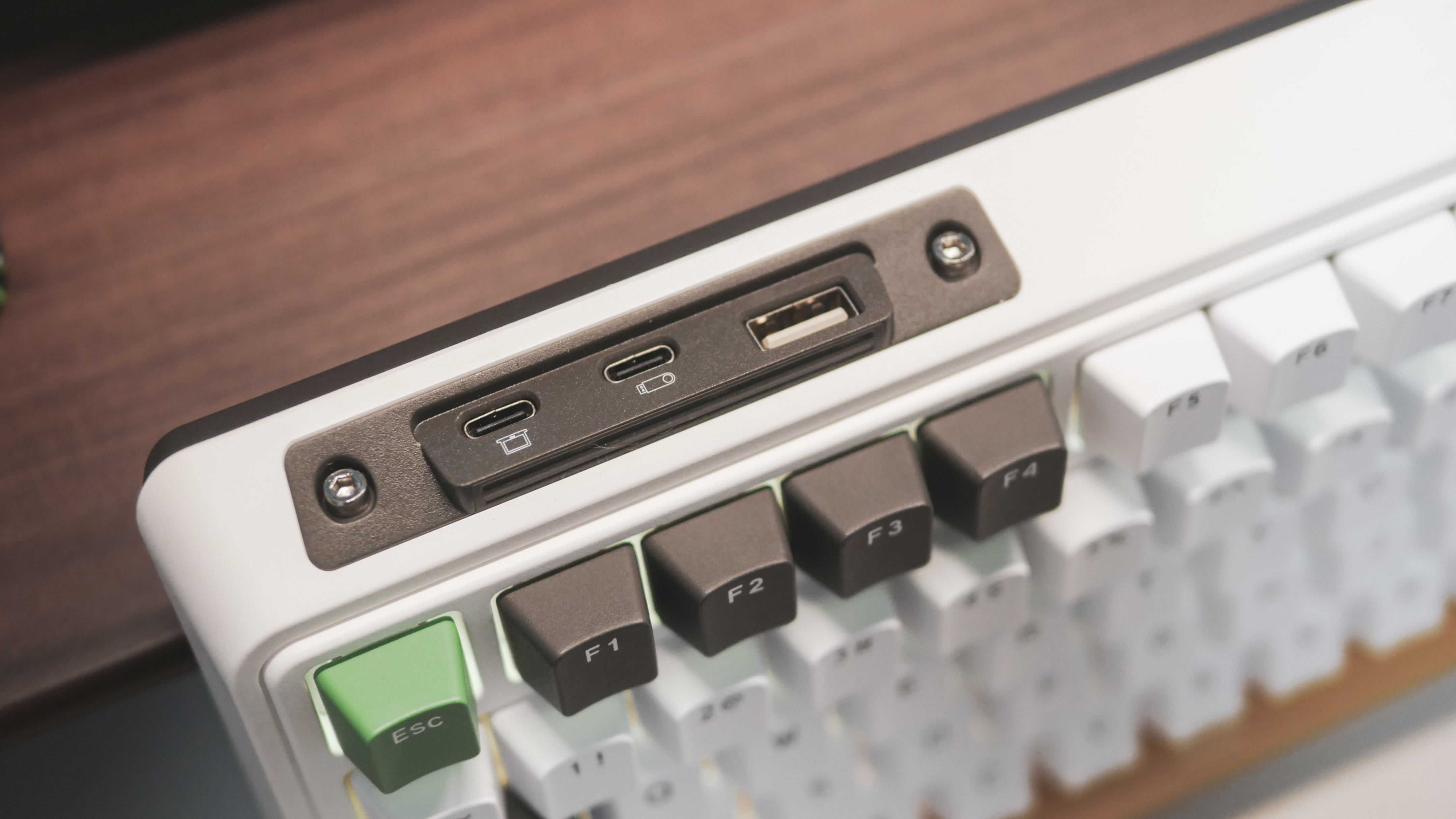 外观设计上,使用复古的造型,加上了四大经典的配色,款款经典,非常迎合现在年轻人的喜好。我使用的这款是经典中的经典,游戏机的配色,从键帽的配上色就可以看出一些马里奥的影子。整体配列使用了75键的配列,右上角有个旋钮拨杆,用于切换连接模式。USB HUB的功能,无线状态下不可用,只能在最左侧的Type-c接口连接电脑的时候进行使用。