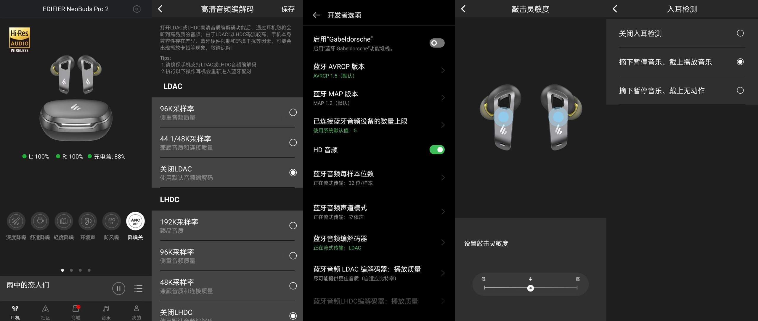 耳机两侧支持触控控制,可以进行电话接听,降噪模式切换,歌曲控制等。触摸控制的灵敏度也可以APP端进行调节。