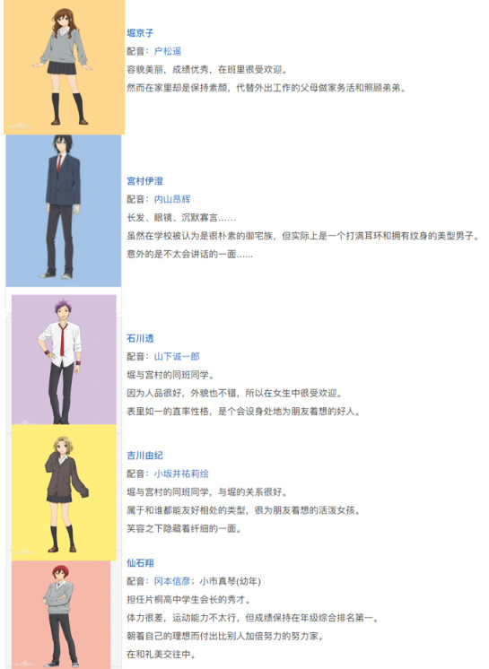 一天,一個 耳朵上打滿了耳洞的刺青男敲響了京子家的大門,穿着居家服的京子去看們,讓她沒有想到的是,眼前這個潮男,竟然是平日裏在班上被評價爲宅男的宮村伊澄(內山昂輝 配音),原來宮村和京子一樣,過着隱祕的雙重生活。以弟弟爲契機,宮村開始頻繁的拜訪京子家,兩人以他們的真面目相對,心與心之間的距離逐漸縮短