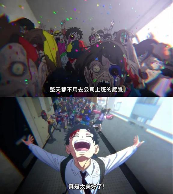 不是傳統意義上正經的喪屍題材作品,殭屍元素僅僅作爲推進劇情的點綴和陪襯,本質更像是披着喪屍皮探討末世背景下人生意義的公路勵志片,被黑心企業與無良上司壓榨奴役的卑微職場社畜,日夜顛倒,無暇喘息,消磨成一具渾渾噩噩的行屍走肉,眼中盡是壓抑晦暗的黑白世界。