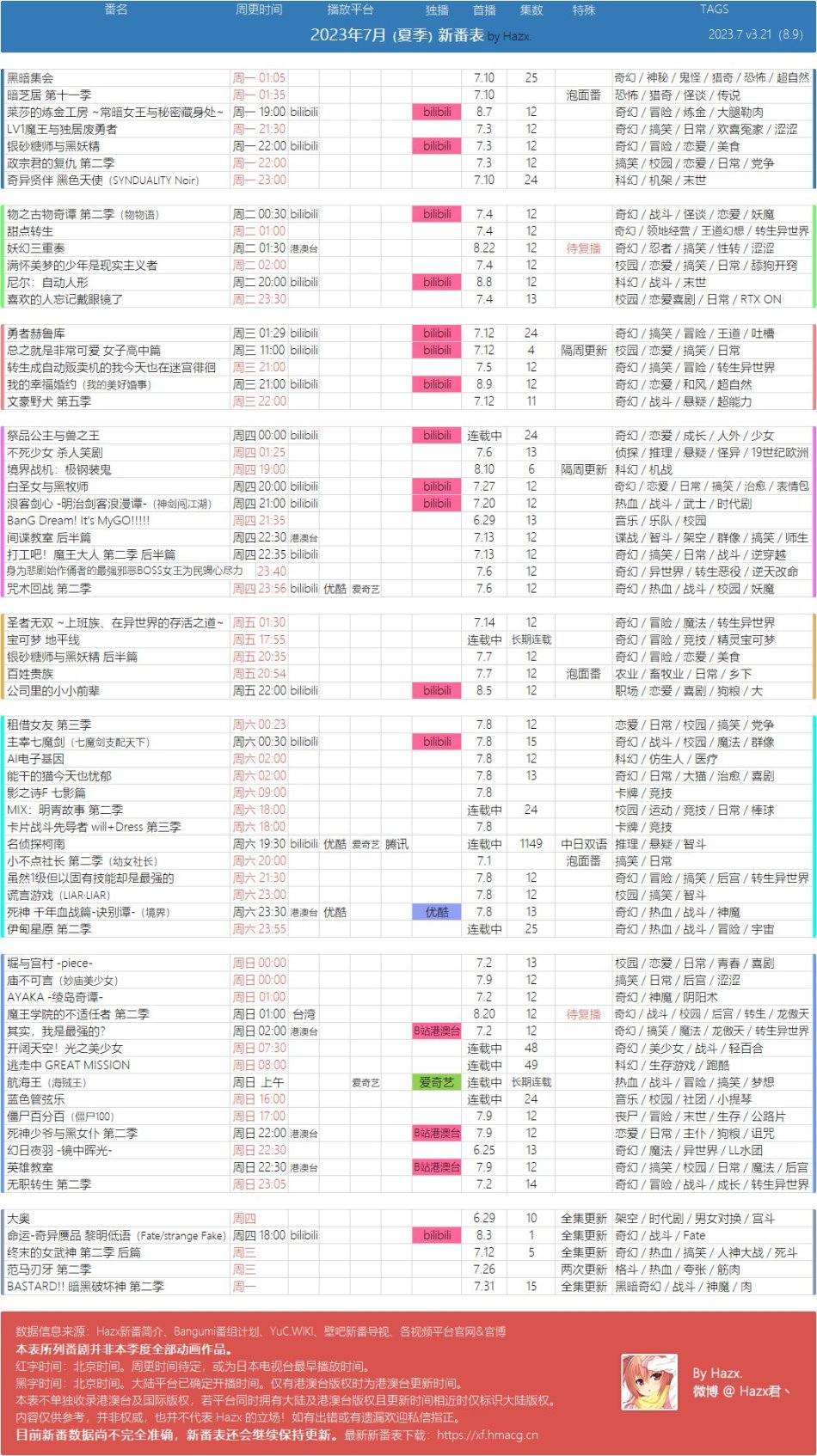 本篇文末附2023年7月新番表和簡介表(仍在更新)