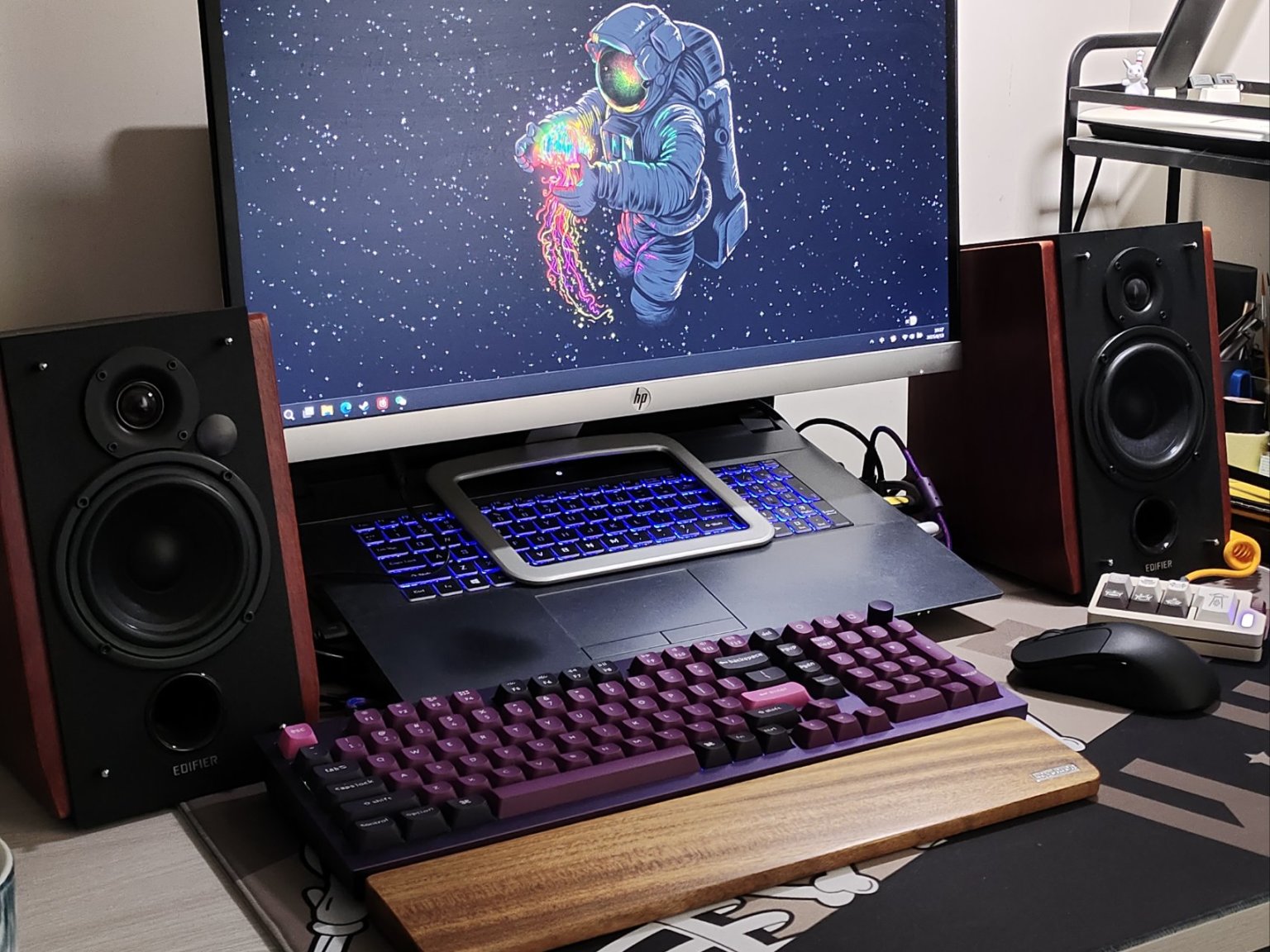 省流:渴创Q5pro键盘+渴创M3鼠标+漫步者R1700音响+承载太多重量之笔记本+承载更多重量之笔记本散热支架+宝藏收纳调味品架