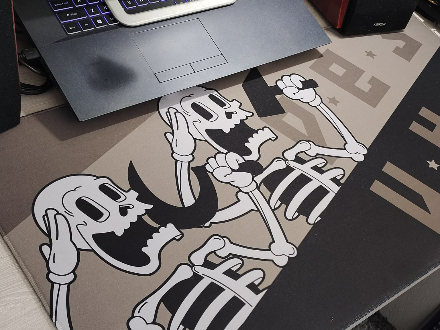 鼠标垫方面因为桌面是办公为主轻游戏,所以主要追求颜值,没有使用专业的游戏垫。这款是我在鱼🐟上淘到的Domikey Яubber 橡皮“A&I”鼠标垫(但是我的垫子估计不是正版),大小900*400,厚度为4mm使用起来很软很舒适。厚一点鼠标垫也可以让键盘和桌子共振减小,从而提升键盘音,不过这点对段落玩家无效。