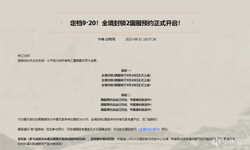 据全境封锁2国服官网的消息,全境封锁2国服将于9月20日正式上线。