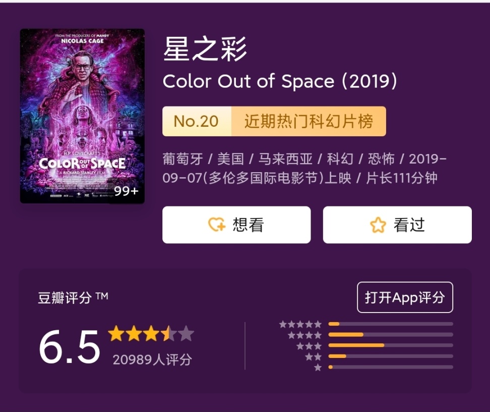 由尼古拉斯凯奇主演的《星之彩》,在刚爆出的时候,很多人唱衰,因为受到原著的一些限制以及前一部《外星色魔》(德国拍的,中文译名)情节过于沉闷的前车之鉴,好在《星之彩》很好的避免了这点,在原著的基础上丰富了“星之彩”的设定,使其更为立体化。