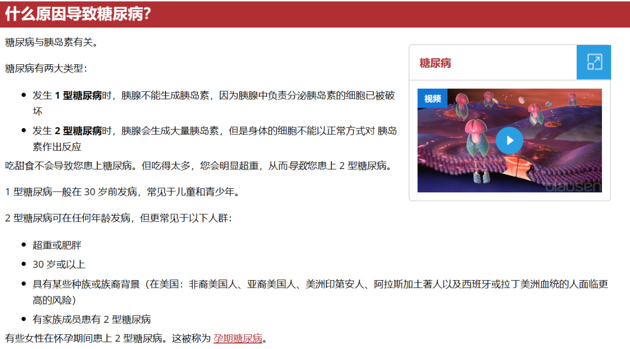 点进“医生如何治疗糖尿病”后,里面会对糖尿病进行详细介绍,从病因、症状到并发症、治疗方法,甚至会在底部提供得到更多有关糖尿病信息的渠道:美国糖尿病协会、JDRF等。
