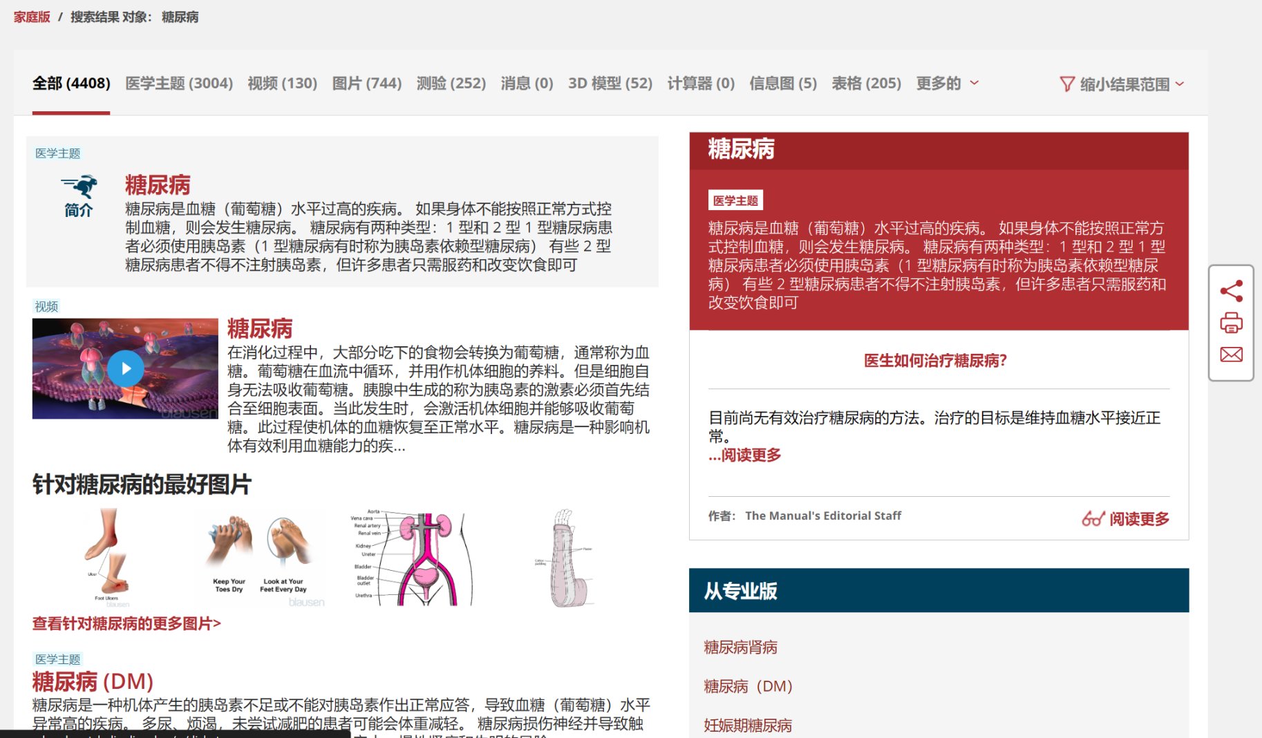 在搜索栏输入“糖尿病”后,页面会出现四千多个医学主题、图片、视频、测验等相关信息。除开糖尿病本身外,还有糖尿病并发症、妊娠期糖尿病影响、糖尿病视网膜病变等相关信息,十分详细。