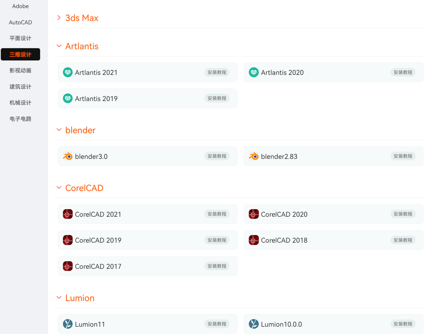 一个专业工具和软件的下载网站,收录了416个专业软件。除了大家都熟悉的Adobe全家桶,还涵盖了AutoCAD、平面设计、三维设计、机械设计等专业软件,例如建筑设计的Civil 3D、Fuzor、Naviswoeks、Revit等,三维设计的blender、CorelCAD、Lumion等(有没有相关专业的盒友说一下用的是这些软件吗),并且贴心地附上安装教程,简直无敌。