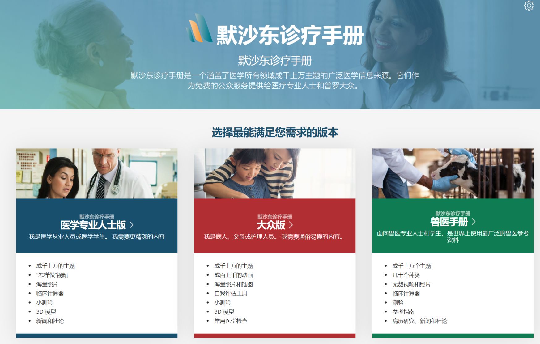 进入网站,提供了医学专业人士版、大众版、兽医手册三个版本。我们普通人一般选择大众版,看更加通俗易懂的内容,值得一提的是,兽医手册只有英文版,但在浏览器翻译的辅助下,也能够进行浏览。