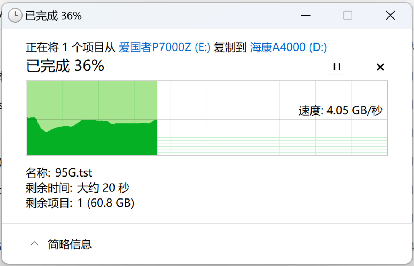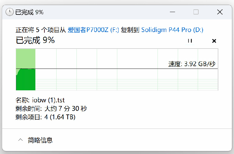 因爲好奇QLC SSD在SLC緩內的實際寫入表現,我又在Win11中向海康A4000拷貝了幾個大文件,結果倒是很讓人驚奇: