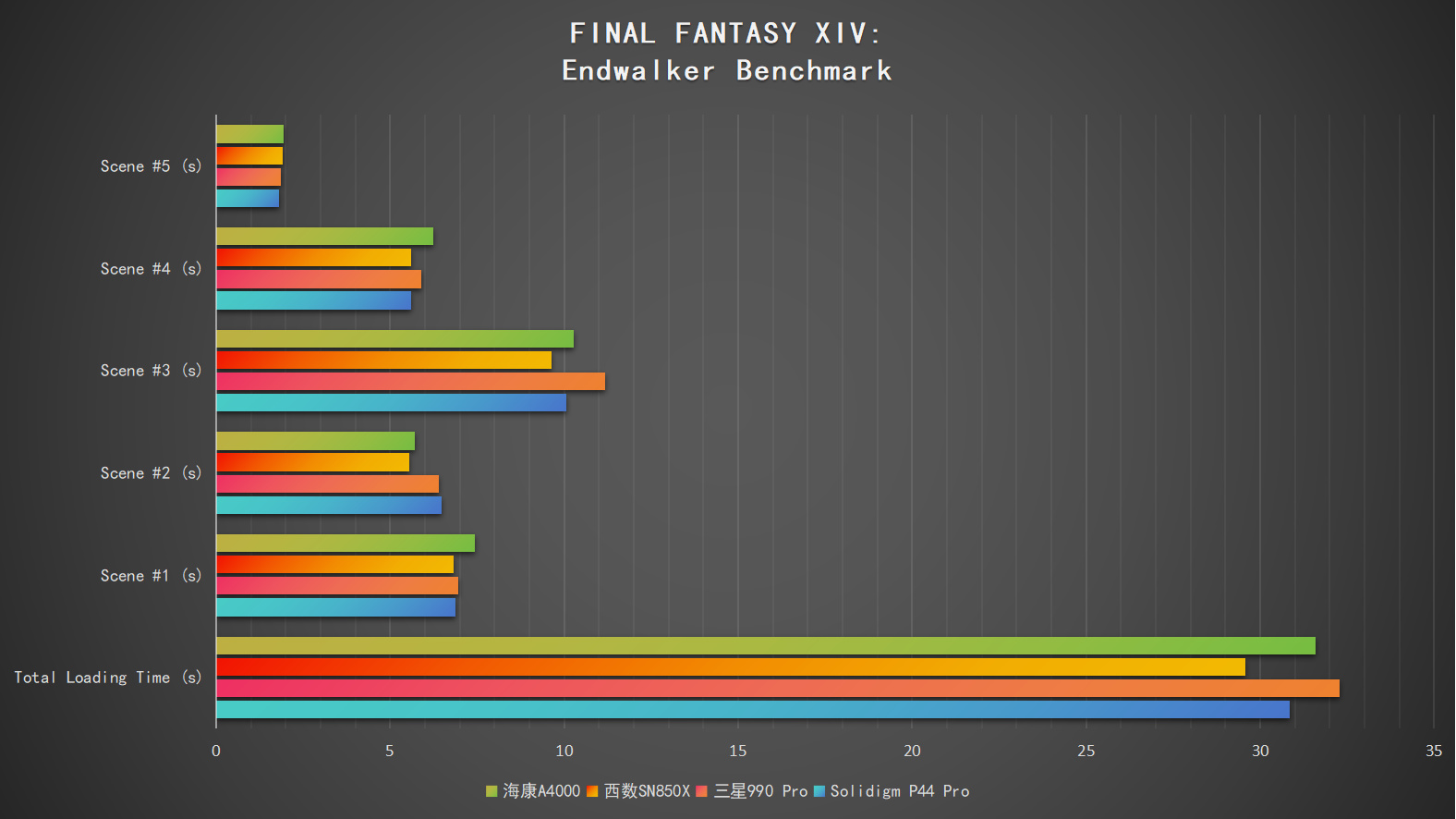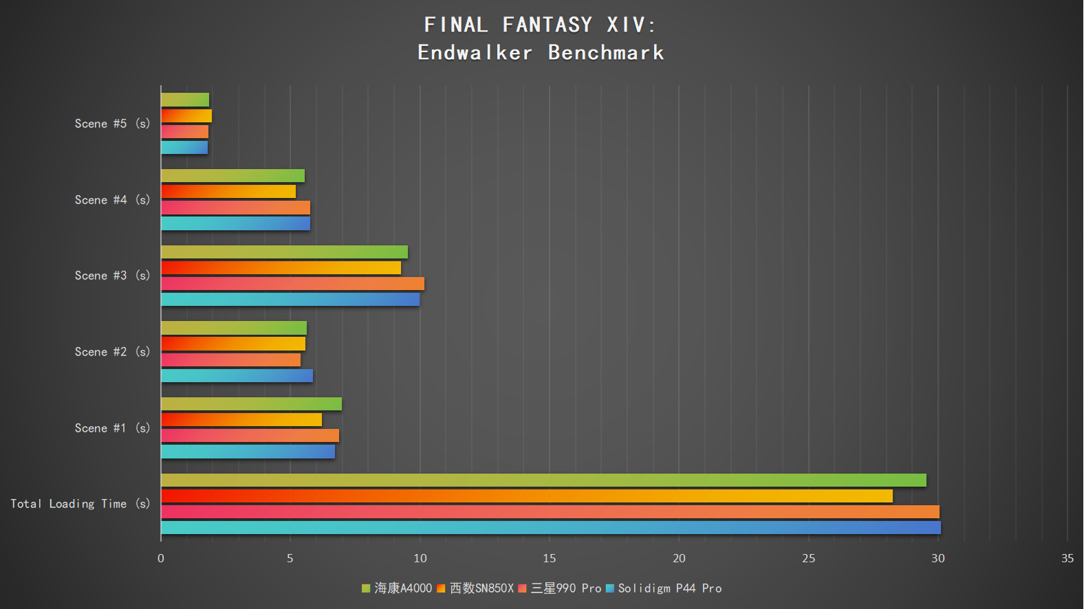 最終幻想14的Benchmark的測試程序支持對5個遊戲場景進行載入時間統計,這裏我們分別對空盤和95%佔用下兩種情景測試,並且和Solidigm P44 Pro、西數SN850X、三星990 Pro這三款旗艦SSD的成績進行橫向對比。