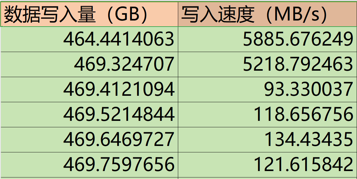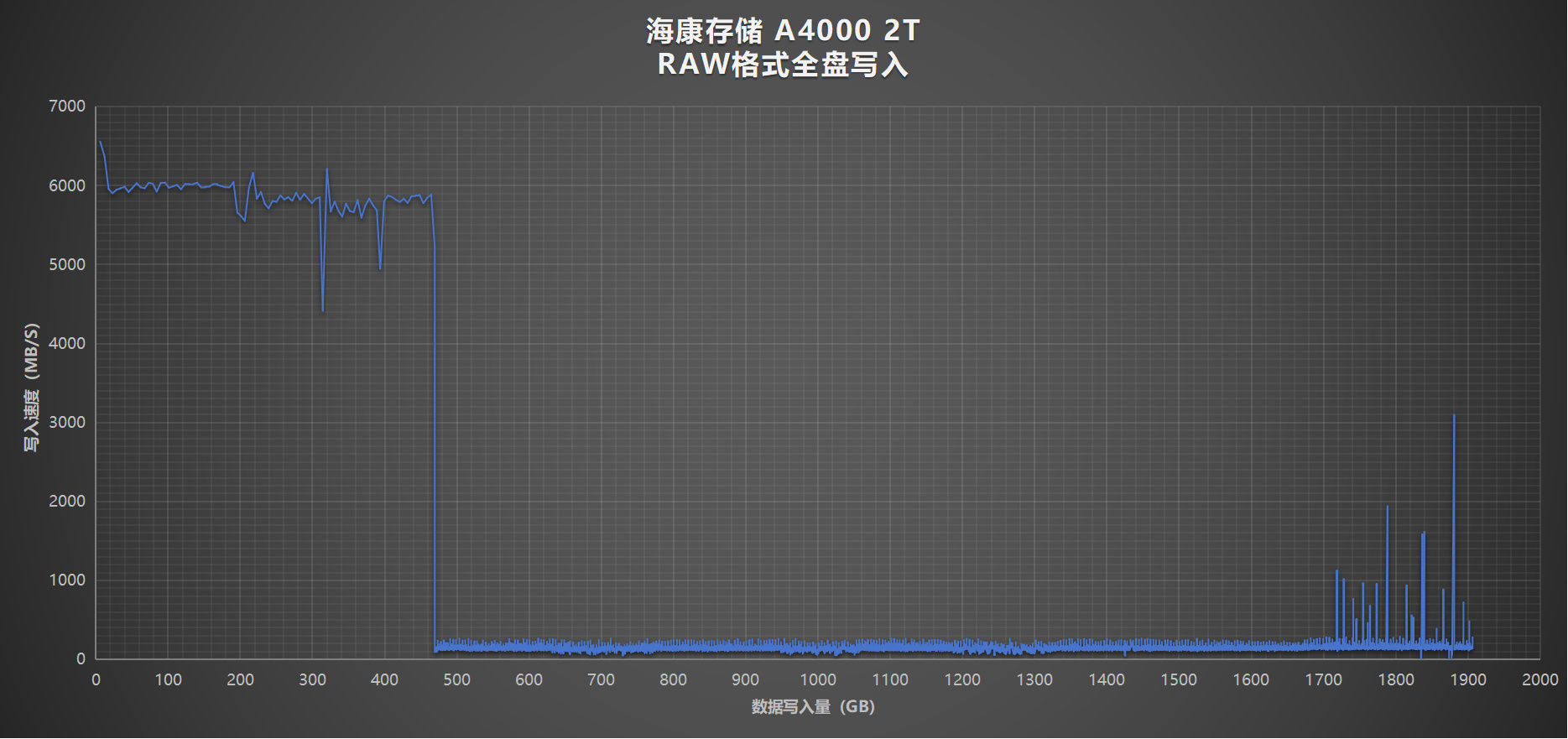 爲了深入探索SSD更深入、更全面的性能表現,這裏我們對海康A4000進行RAW格式下的全盤順序寫入測試,以觀察整體的寫入性能和SLC緩存的方案。