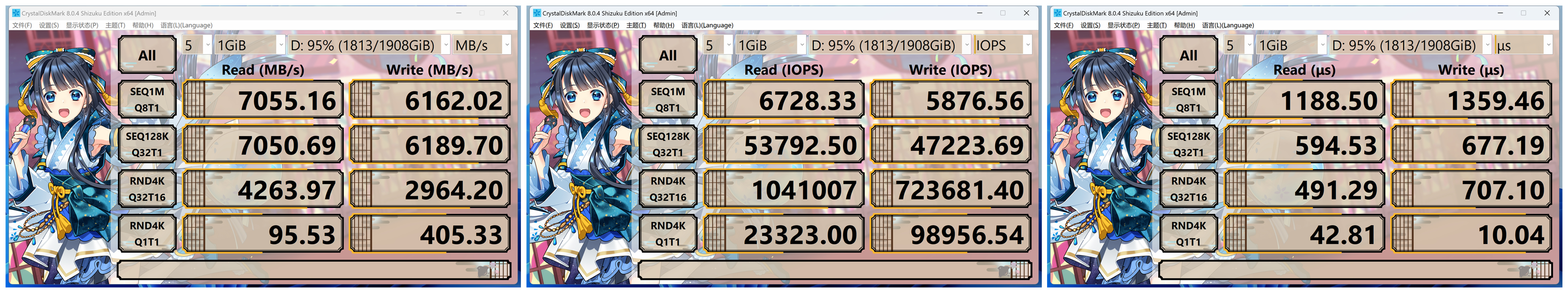 95%滿盤狀態下,海康A4000的順序讀取速度爲7055MB/s,順序寫入速度爲6162MB/s,與空盤狀態相比並沒有發生明顯的性能下降,並且在如此高佔用的情況下也沒有SLC緩存失效的痕跡。