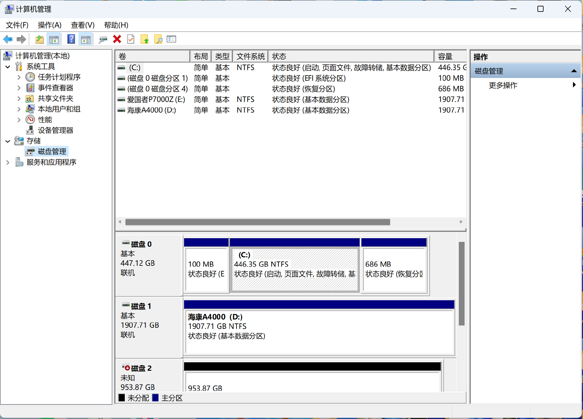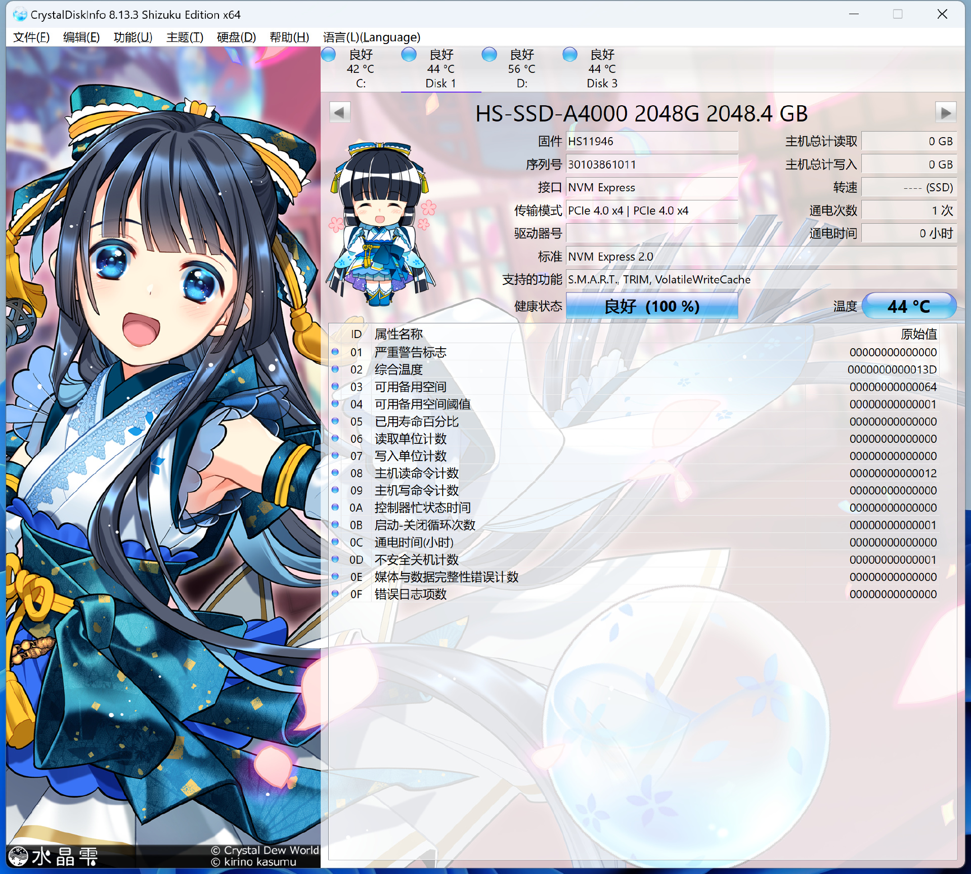 在CrystalDiskInfo中可以看到海康A4000是足容的2048G容量,支持最新的NVMe 2.0協議標準。由於二進制與十進制的轉換關係,其在WIndows中的實際可用容量爲1907G。