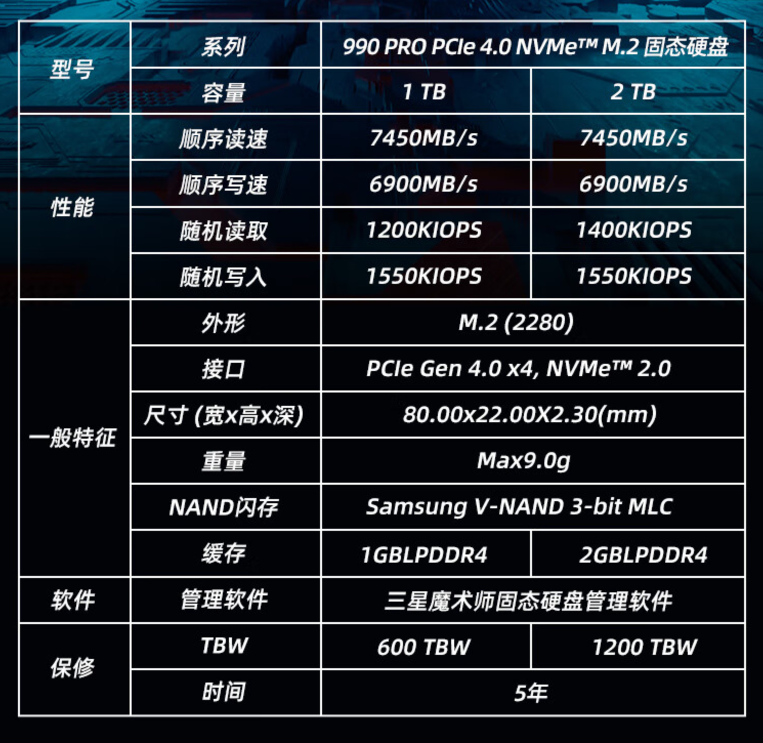 此次我入手的爲2T版本,官方標稱的順序讀取速度爲7100MB/s,順序寫入速度爲6350MB/s,單就順序讀寫速度來看就是一塊標準的PCIe4.0滿速盤。另外可以看到標稱的4K隨機讀寫速度要比同容量的海康C4000低了一點,還是有些保守了。