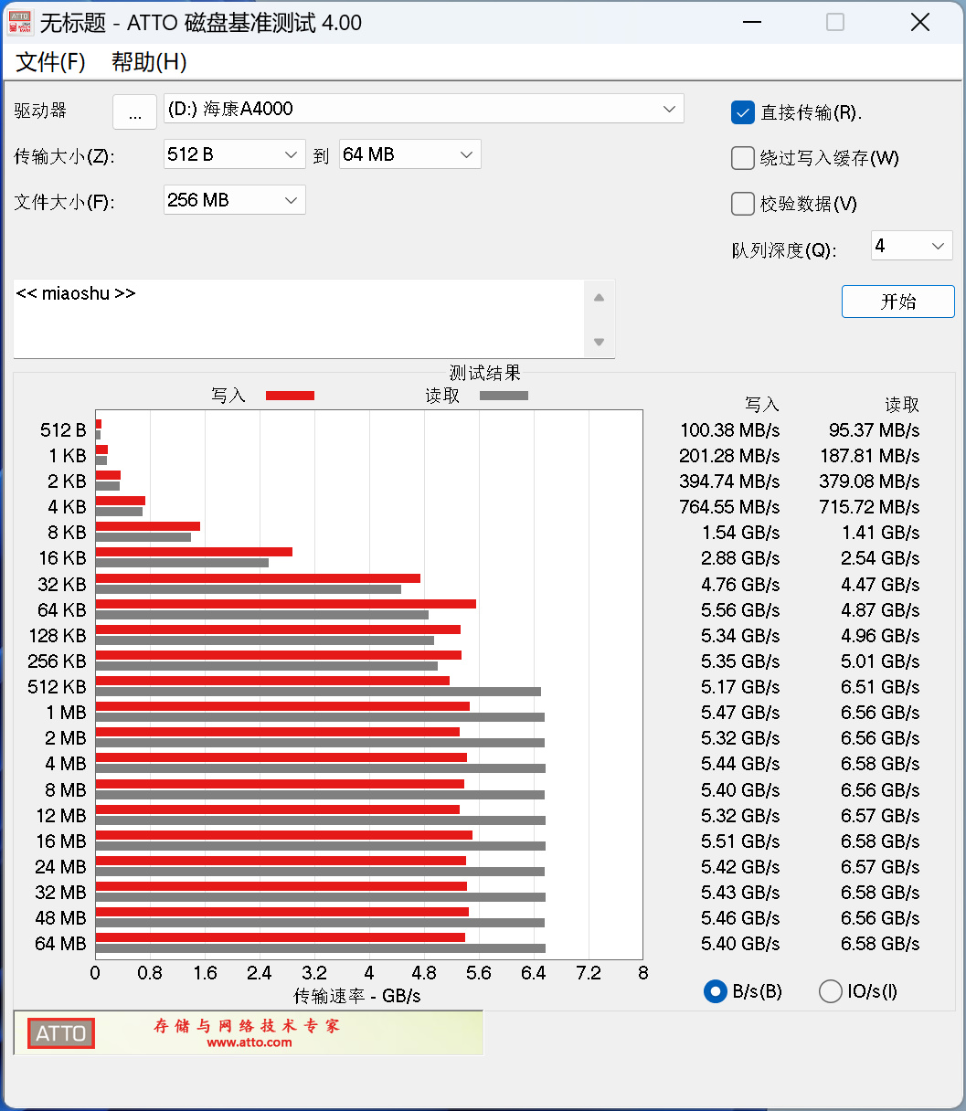 ATTO在測試時,會將數據包按512B, 1KB, 2KB直到到64MB的不同大小進行分別讀寫測試,測試完成後的速度結果用柱狀圖的形式表達出來,可以很好地說明不同文件大小下對SSD速度的影響。