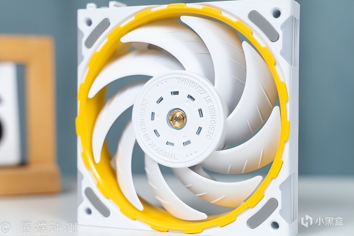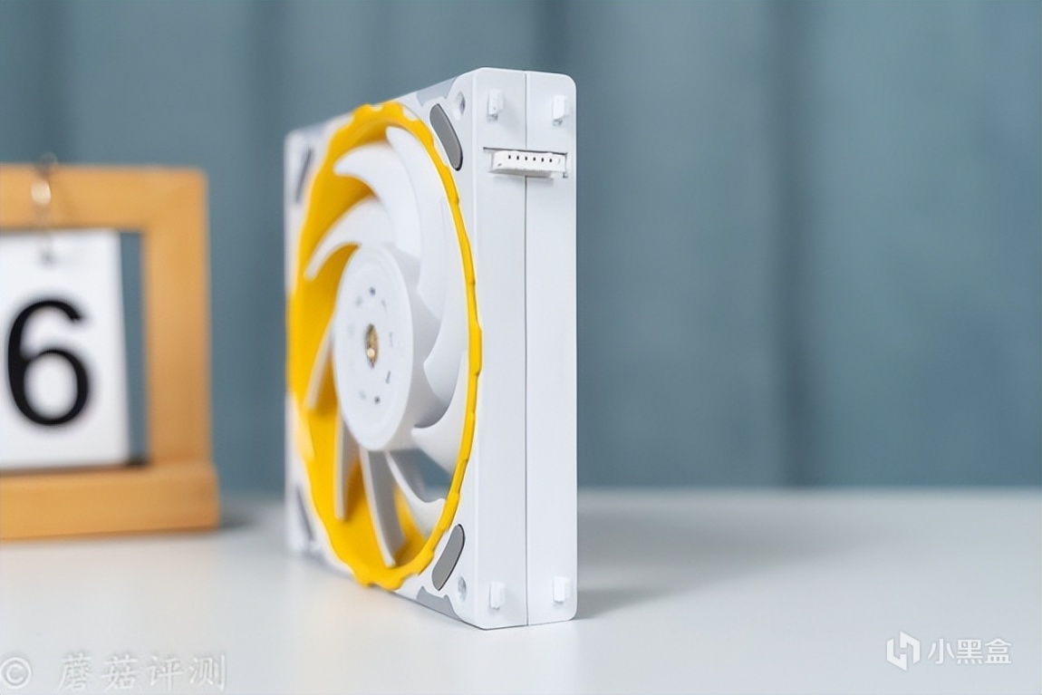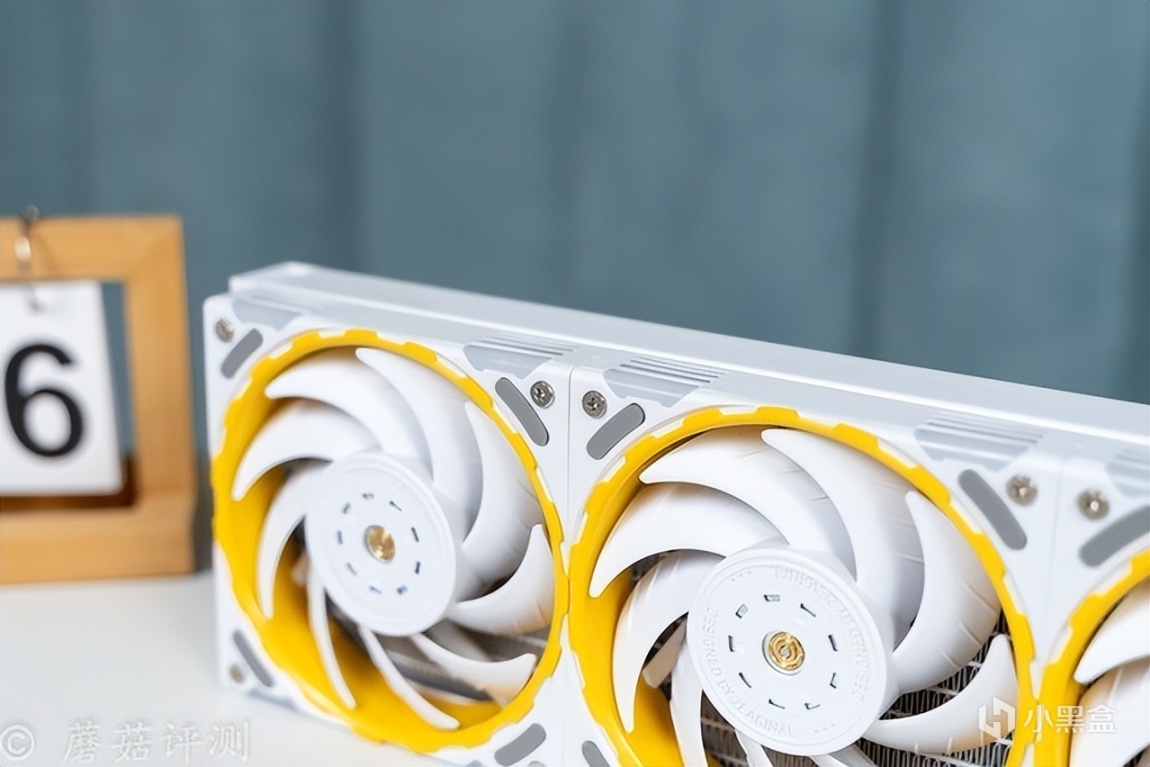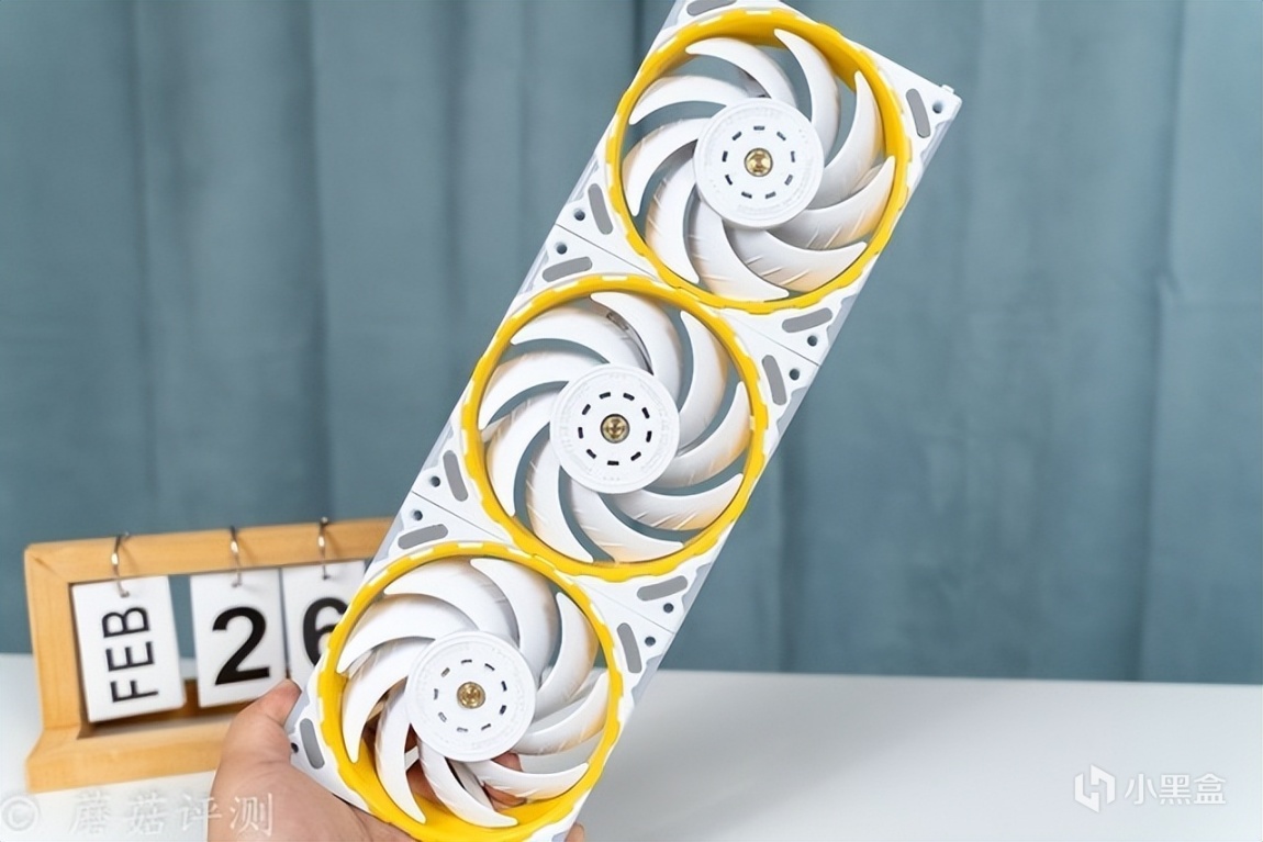 另外,最让蘑菇感到意外的是这款水冷的冷排风扇,本身的硬件参数就有点出众,风量76CFM、风压3.24mmH2O,而且这款风扇还有一些特殊的玩法。首先是支持组合,可以通过风扇两侧的接口和卡扣,巧妙的组合成两把、三把、甚至更多,多把风扇仅使用单线供电。其次是风扇的内侧黄色装饰部分支持快拆,搭配不同的配件,可以实现不同的配色效果,有点意思。