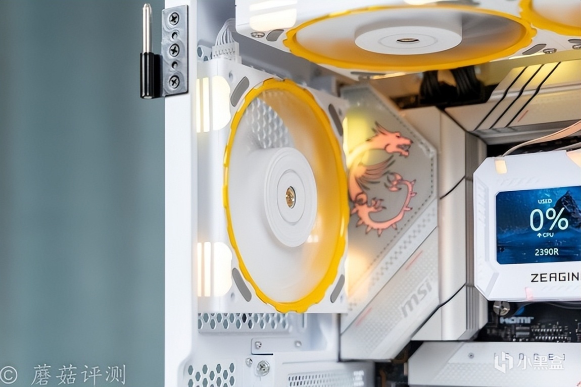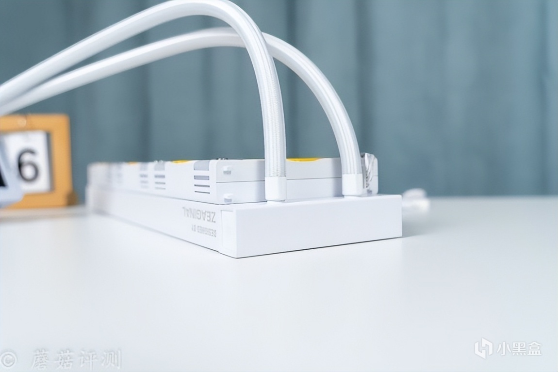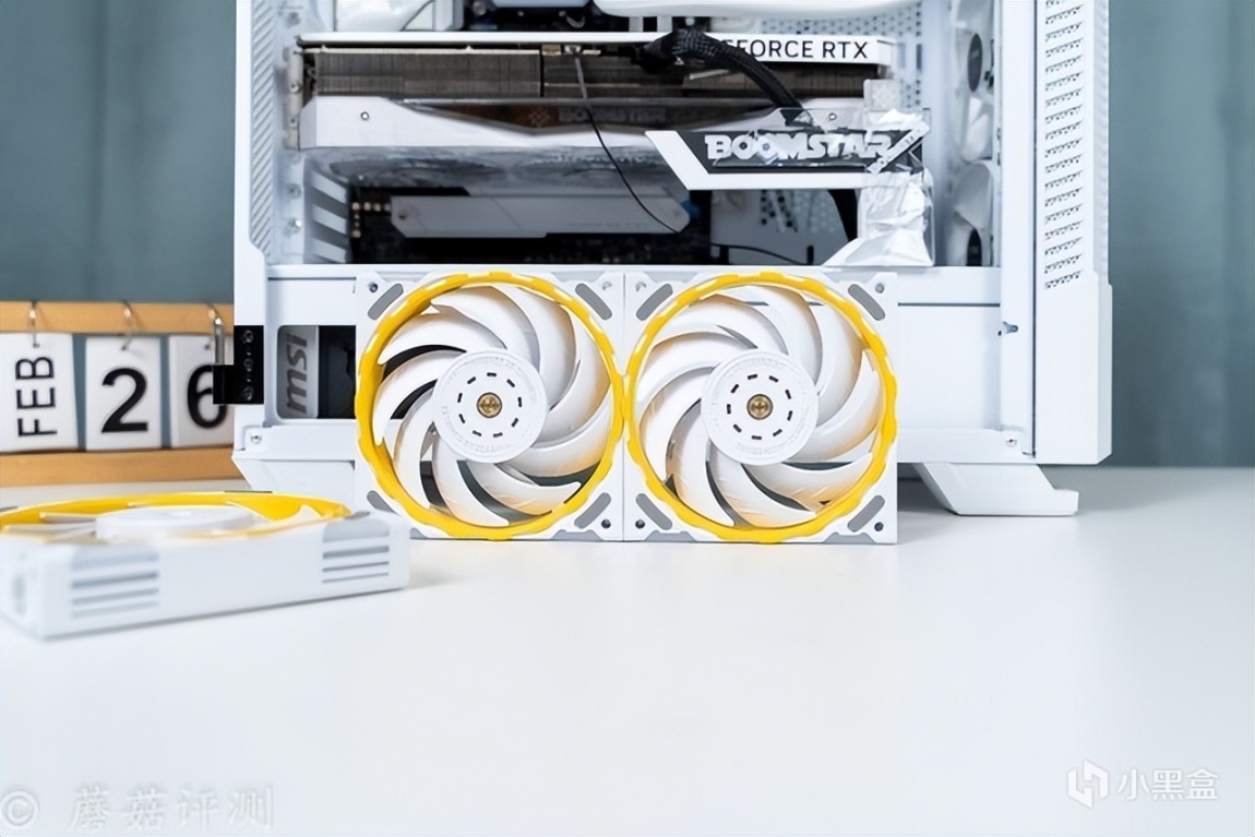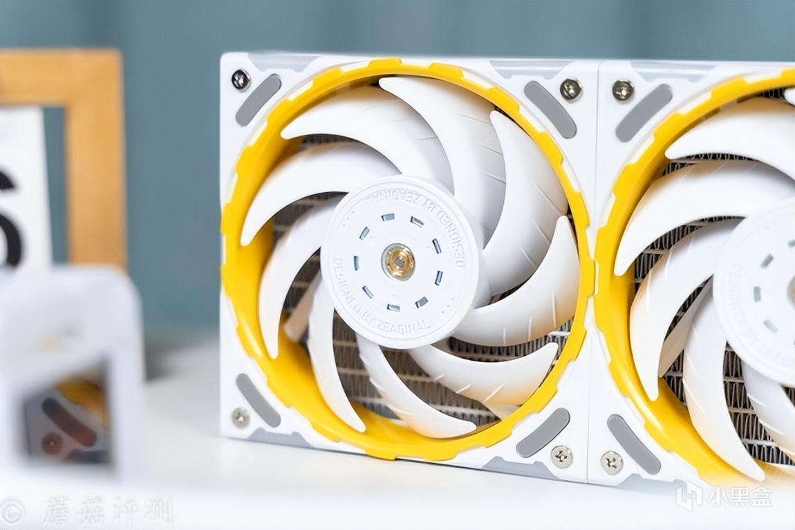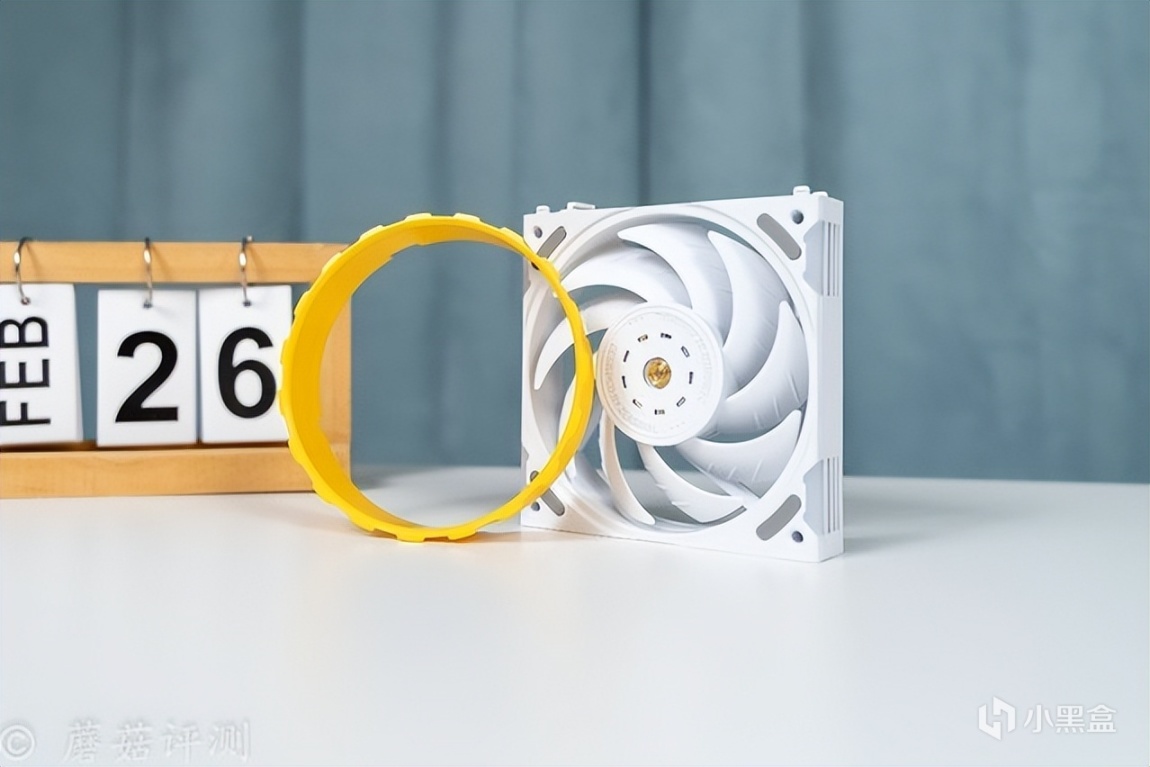 另外,最让蘑菇感到意外的是这款水冷的冷排风扇,本身的硬件参数就有点出众,风量76CFM、风压3.24mmH2O,而且这款风扇还有一些特殊的玩法。首先是支持组合,可以通过风扇两侧的接口和卡扣,巧妙的组合成两把、三把、甚至更多,多把风扇仅使用单线供电。其次是风扇的内侧黄色装饰部分支持快拆,搭配不同的配件,可以实现不同的配色效果,有点意思。