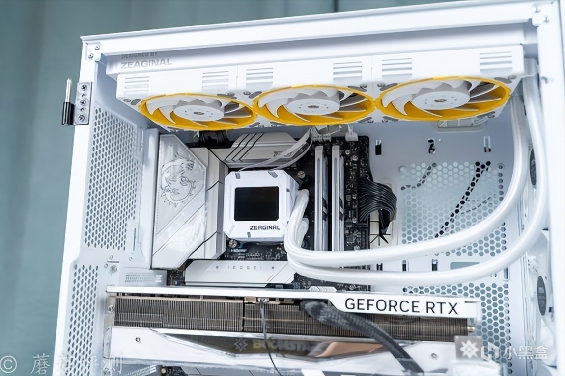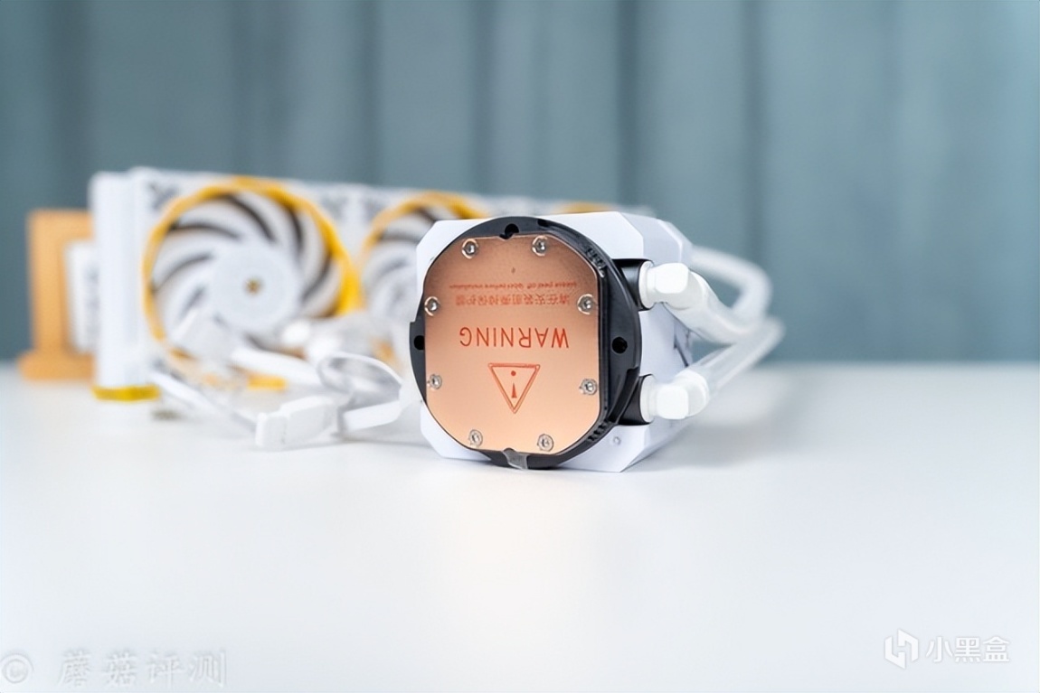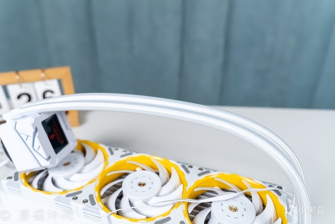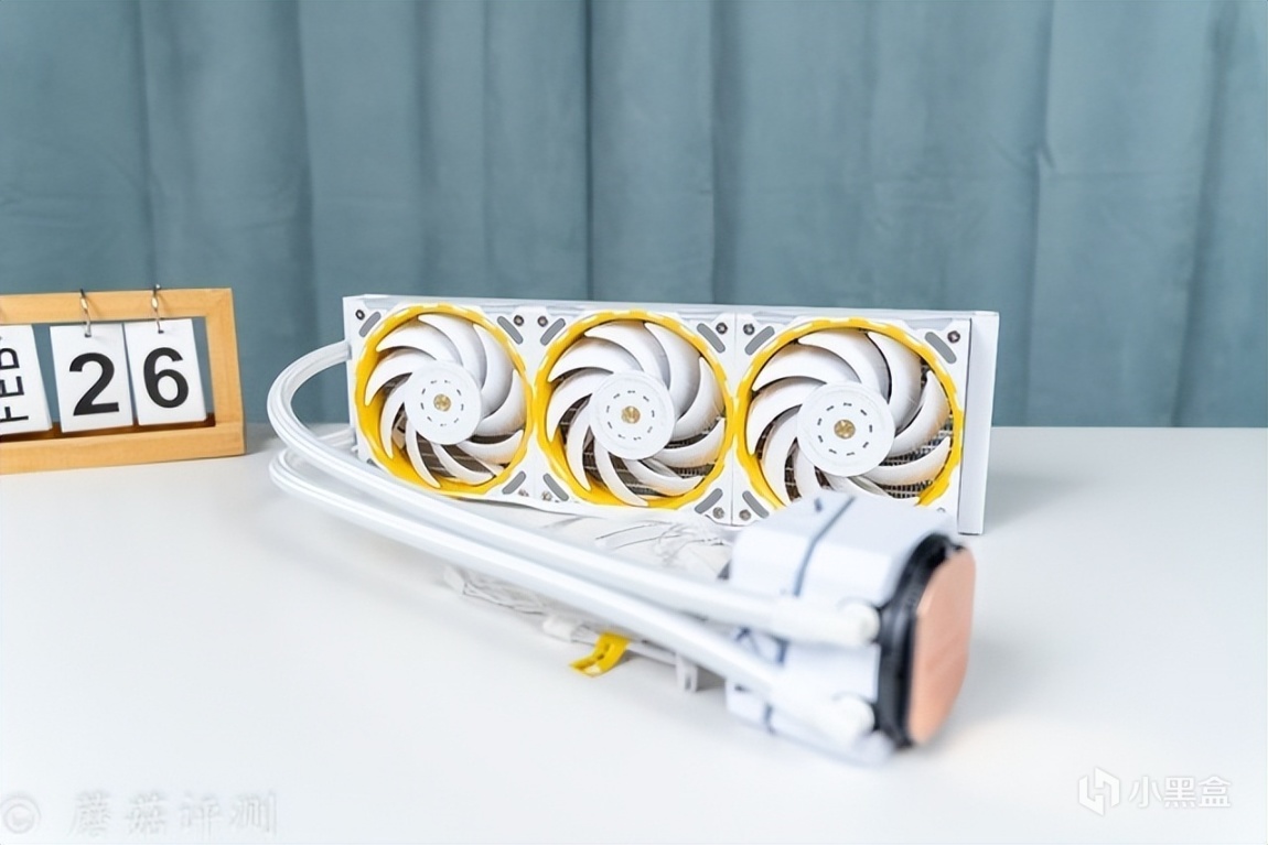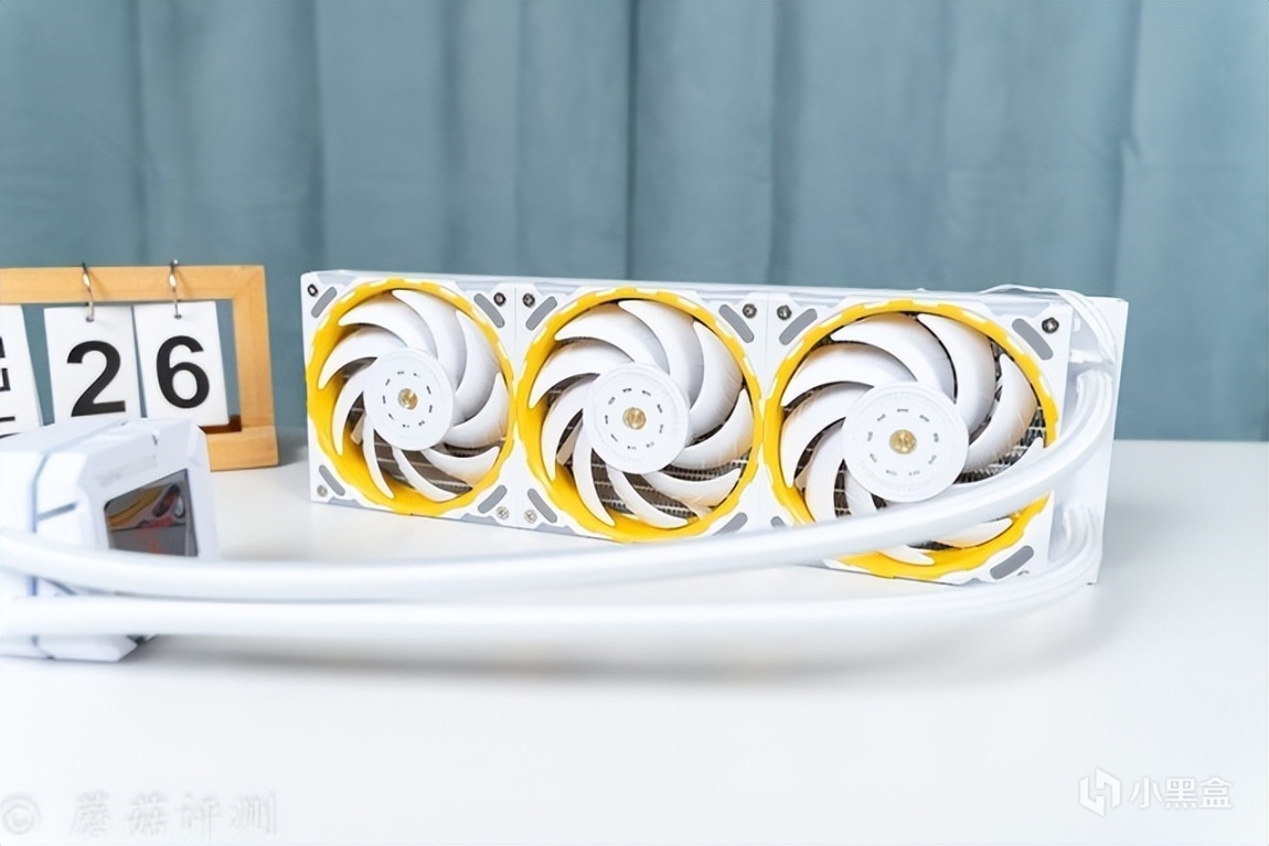 ▼水冷排风扇非常漂亮,中间扇叶是白色的,外圈有黄色的外观装饰设计。