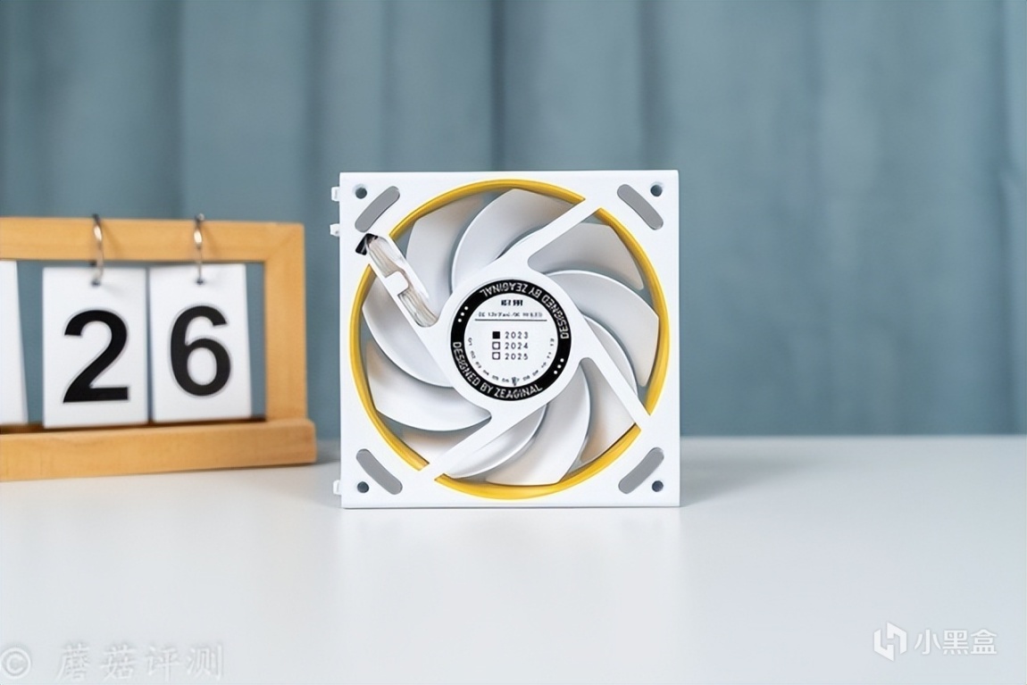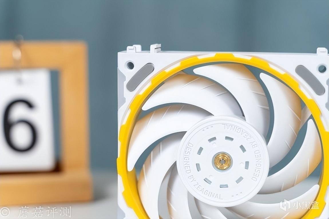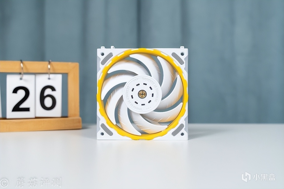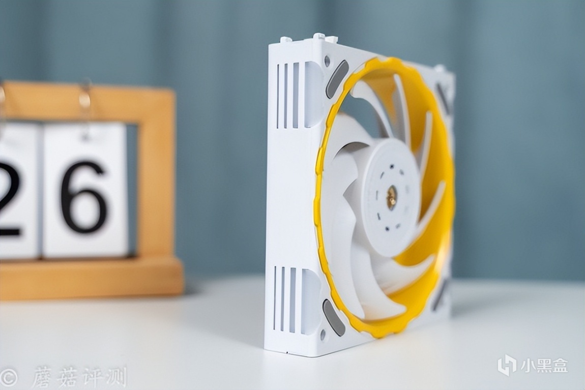 ▼风扇有黑、白两色可选,这款是白色的,扇叶和风扇框架部分都是白色的,中间点缀一层黄色的塑料件。