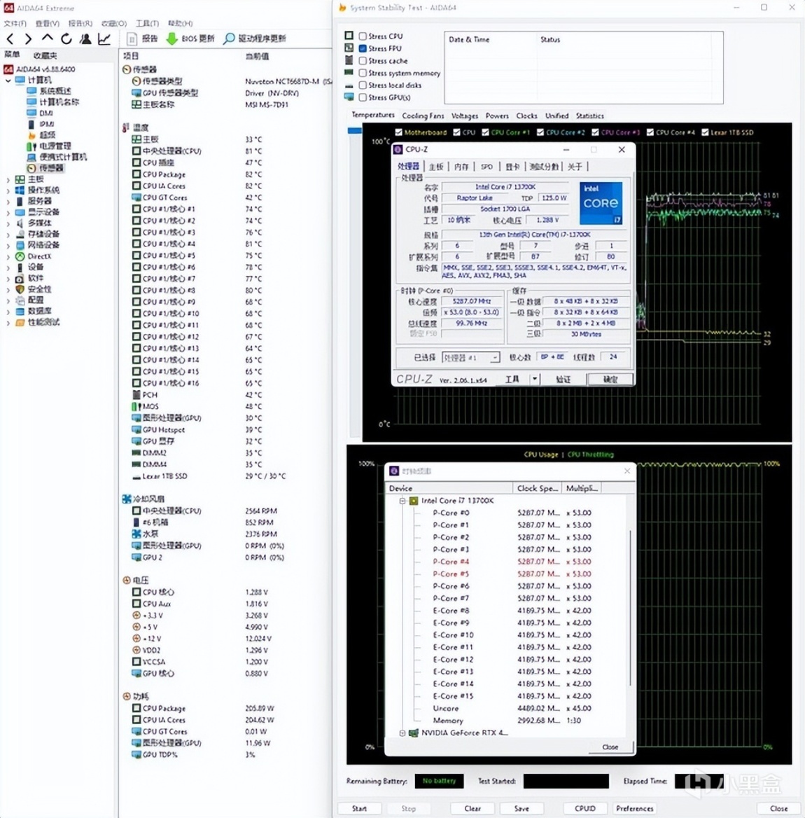 ▼简单跑个CPU-Z的压力测试,处理器功耗在210W左右,大核心睿频5.3GHz、小核心睿频4.2GHz,温度81℃,大核心温度在77℃左右、小核心温度在67℃左右,整体散热情况表现不错。