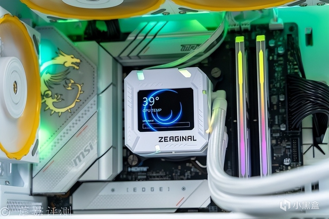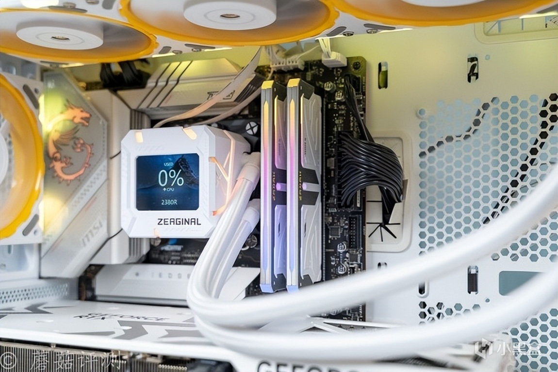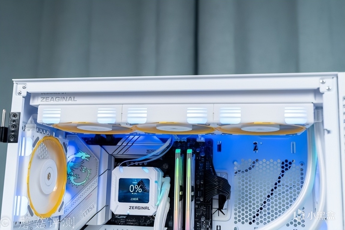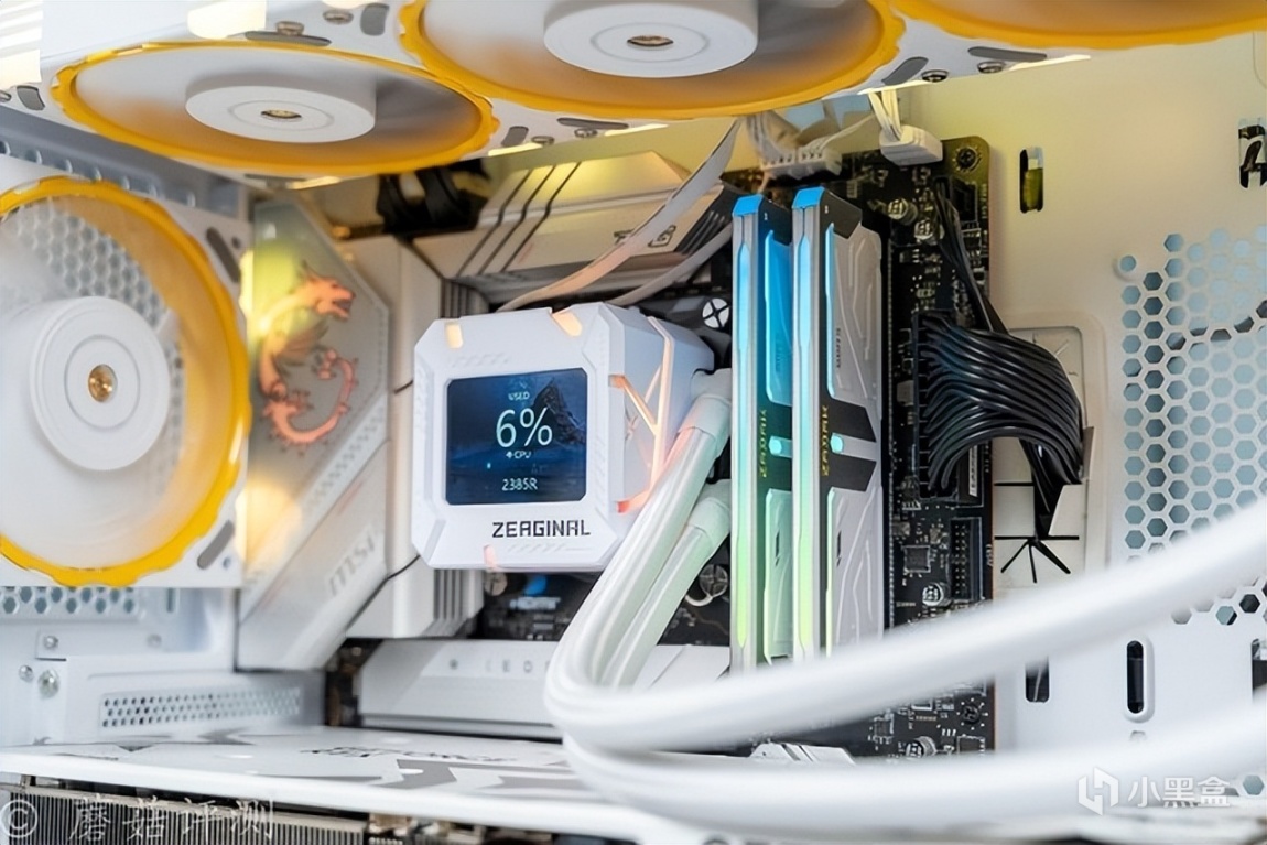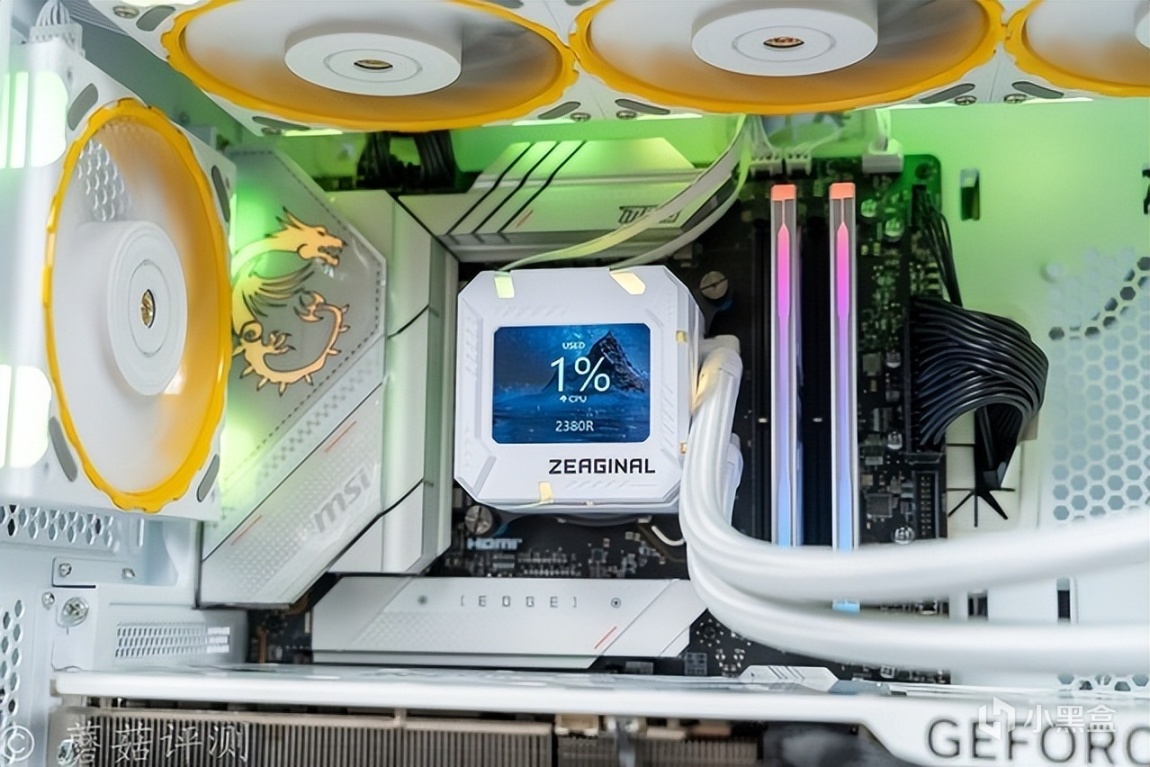 ▼水冷轻松固定到机箱的顶部,水冷头正确安装,水冷管的水管放在了右侧。