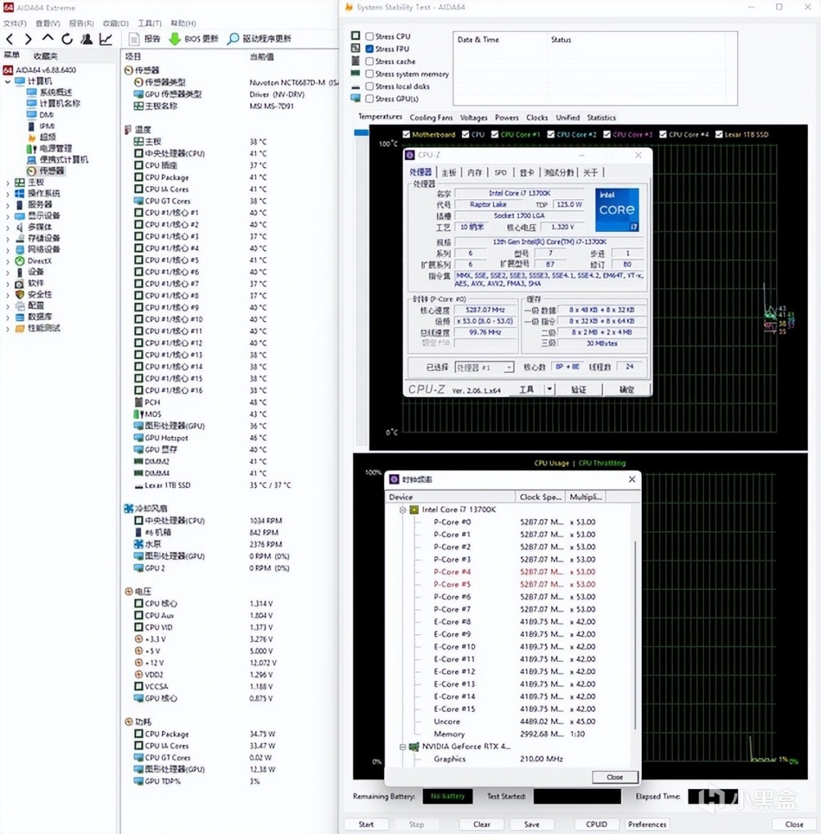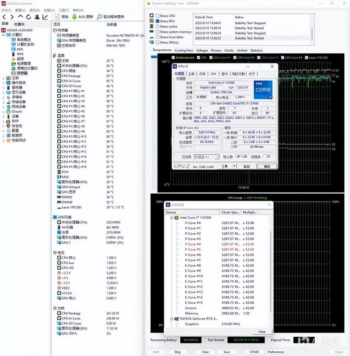 水冷的散热效能方面的表现还是非常不错的,在室温26℃左右的情况下,面对默频265W功耗的13700K,其可以稳稳的让13700K处理器保持峰值睿频,大核心稳定在5.3GHz、小核心稳定在4.2GHz,大核心温度最高去到93℃,其余核心均只有88℃左右,表现非常不错。