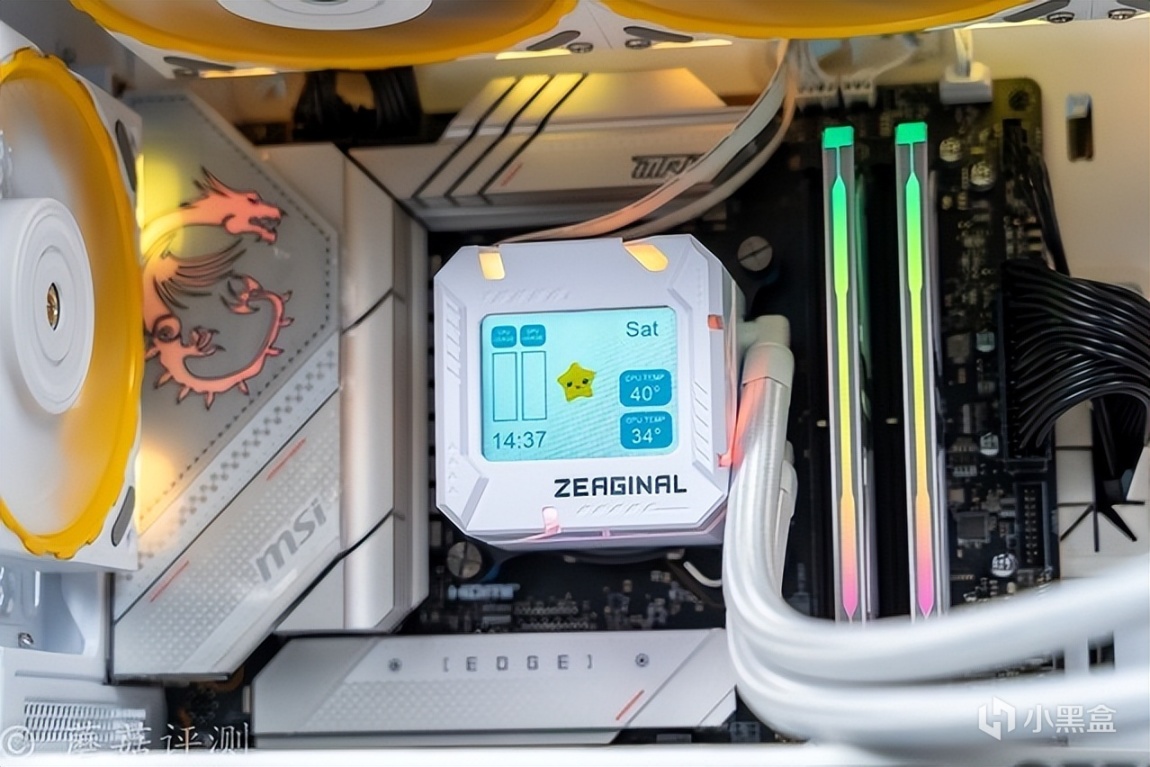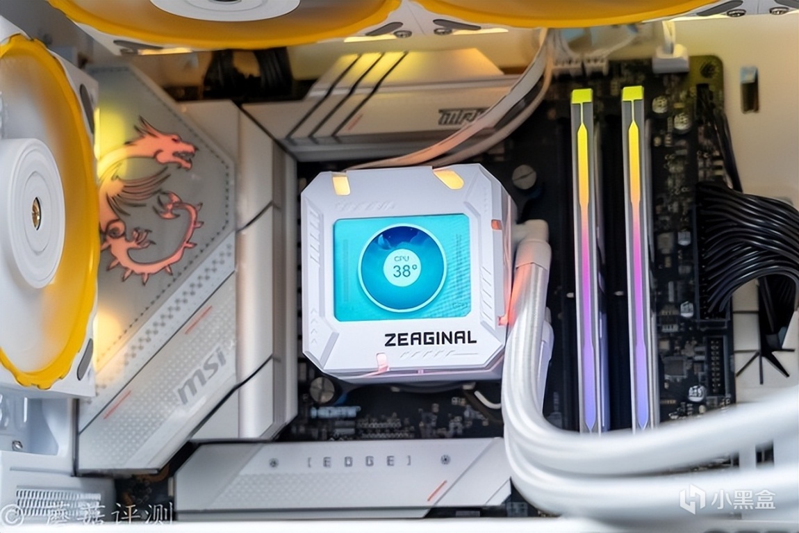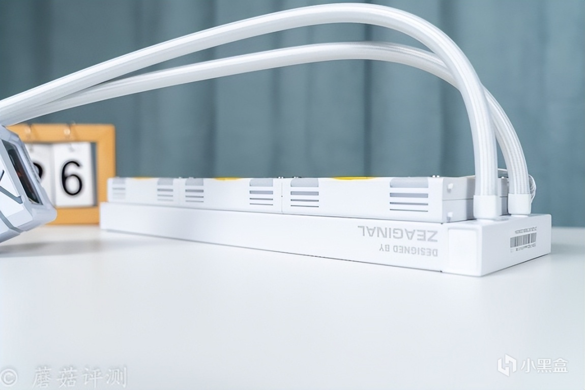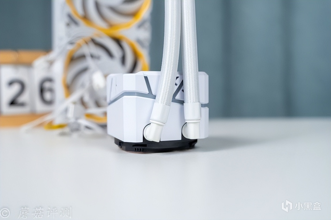 ▼水冷的外观挺漂亮的,整体是白色的,冷排风扇部分点缀了一些黄色。