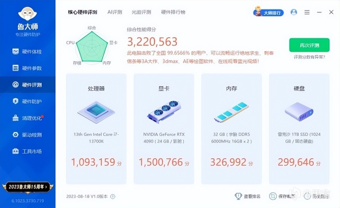 ▼简单跑个整机测试,整机得分322W,其中处理器单独得分109W,显卡单独得分150W,性能很强。