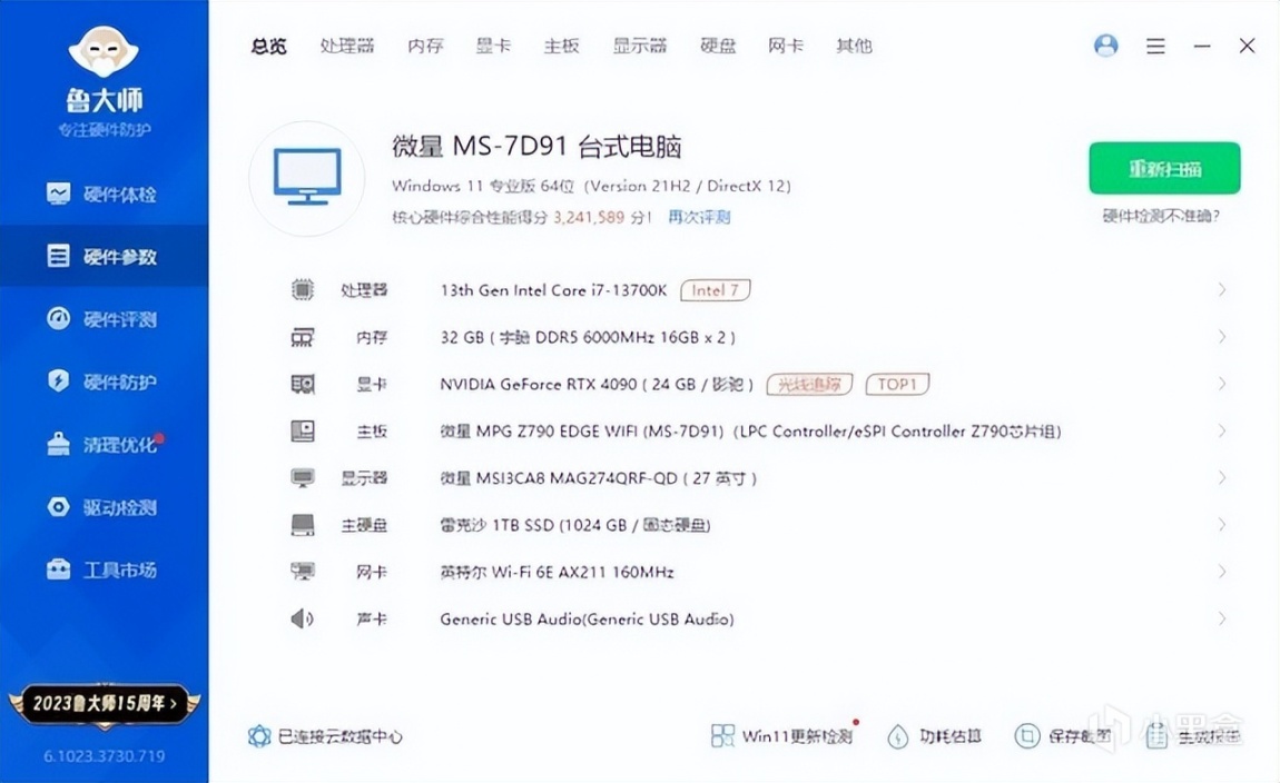 ▼简单看下整机配置,处理器是13700K,主板是微星的Z790刀锋D5,显卡是影驰的RTX4090星耀OC。
