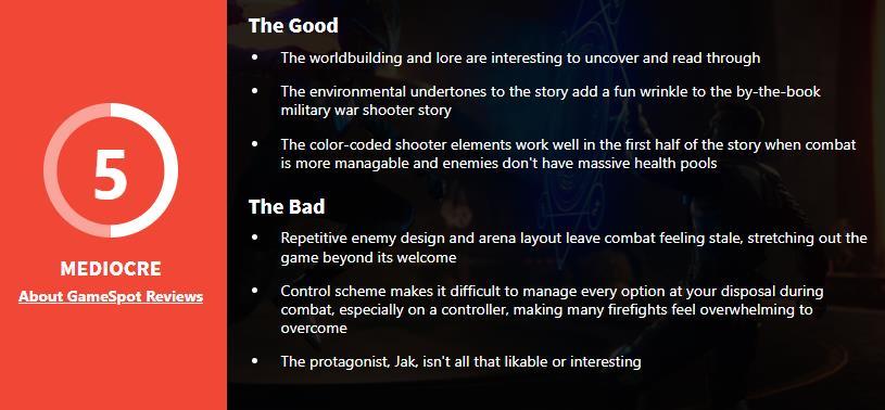 然而,Gamespot的评论则指出,《不朽者传奇》并没有将引人入胜的环境和故事融入其传统的军事射击情节中。相反,游戏选择使用这些叙事元素来呈现其世界设计和传说。这使得整个故事显得不够成熟,同时也凸显了主角不受欢迎的反常行为。游戏的射击体验在前半部分表现出色,尤其在战斗被设计为一个彩色编码谜题的情况下。然而,游戏也存在一些不足之处,例如敌人和竞技场布局的重复使用导致体验变得单调,而在战斗达到高潮时,玩家难以有效地应对大量的战斗选择。总体而言,Gamespot认为《不朽者传奇》在某些方面表现出色,但不足以强烈推荐。